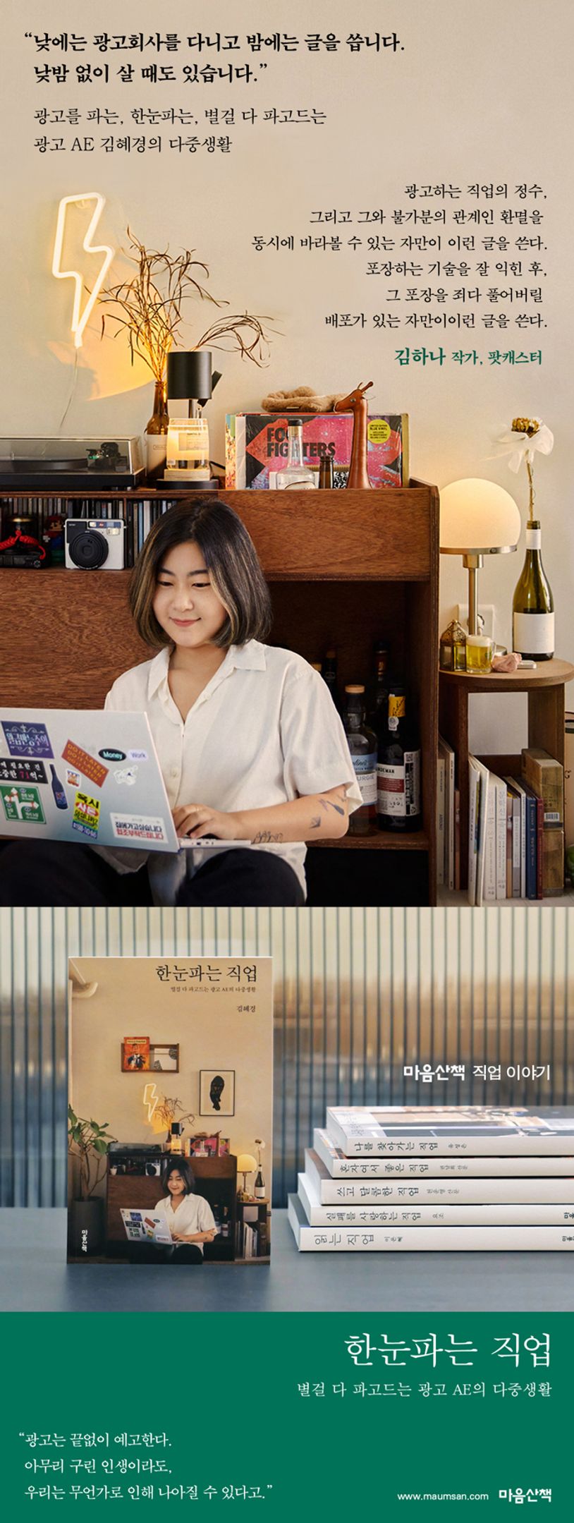 “끝없이 한눈팔며 별걸 다 파고드는 나는, 계속해서 그럴 예정이다. 한쪽 눈은 광고에 팔고, 다른 눈은 세상에 팔고. 할 수 있는 한 오래오래, 내가 파고들 숫자를 한없이 늘려가면서.” 광고 AE 김혜경의 『한눈파는 직업』이 출간되었다. 광고 일과 글쓰기 둘 다 ‘아웃풋’이 있으려면 ‘인풋’이 있어야 한다고 말하는 저자는, ‘파는’ 일의 여러 가지 해석을 통해 그 모든 과정을 이해한다. 글쓰기는 나만의 생각을 ‘파는’ 일이며, 광고는 나뿐만 아니라 남의 아이디어까지 ‘파는’ 일이다. 그리고 이 두 가지는 나 자신을 ‘파내는’ 일이기도 하다. 금세 동나는 나를 채우기 위해 저자는 끊임없이 한눈을 ‘판다’.