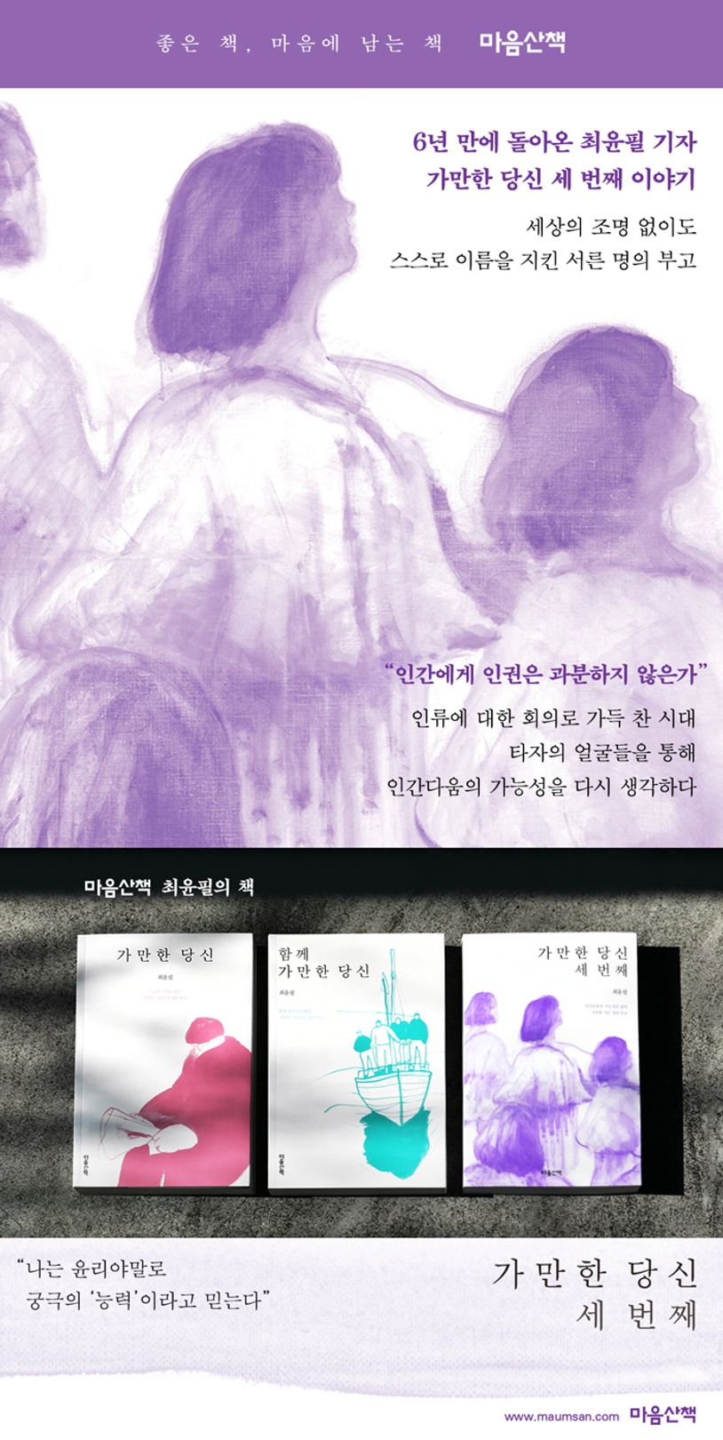2016년 나란히 출간되었던 『가만한 당신』 『함께 가만한 당신』을 잇는 책 『가만한 당신 세 번째』가 6년 만에 돌아왔다. 한국일보 최윤필 기자가 연재 중인 동명 칼럼 「가만한 당신」은 세상으로부터 소외당했지만 스스로 자신의 이름을 지키고 끝끝내 살아낸 사람들의 부고이다. 죽은 이의 이름을 부르고 그의 삶을 기록하는 행위는 그 자체로 윤리적인 선택이다. 최윤필 기자의 시선은 주로 소수자에게 향한다. 소수자는 경계에 서 있기 때문에 끊임없이 자신의 자리를 확보하고자 분투하는 존재다. 그렇기에 누구보다 생을 빚어내는 에너지를 뿜어내기도 한다. 『가만한 당신 세 번째』는 경계를 지우면서 가능성의 공간을 넓힌 소수자들의 역동성을 포착한다. 책에 등장하는 트랜스젠더 과학자 벤 바레스, 아프리카에 대한 클리셰를 깨부순 작가 비냐방가 와이나이나, 지적장애인으로서 ‘스페셜올림픽’ 창설에 큰 역할을 한 마이클 큐잭 같은 인물들이 대표적인 사례이다.