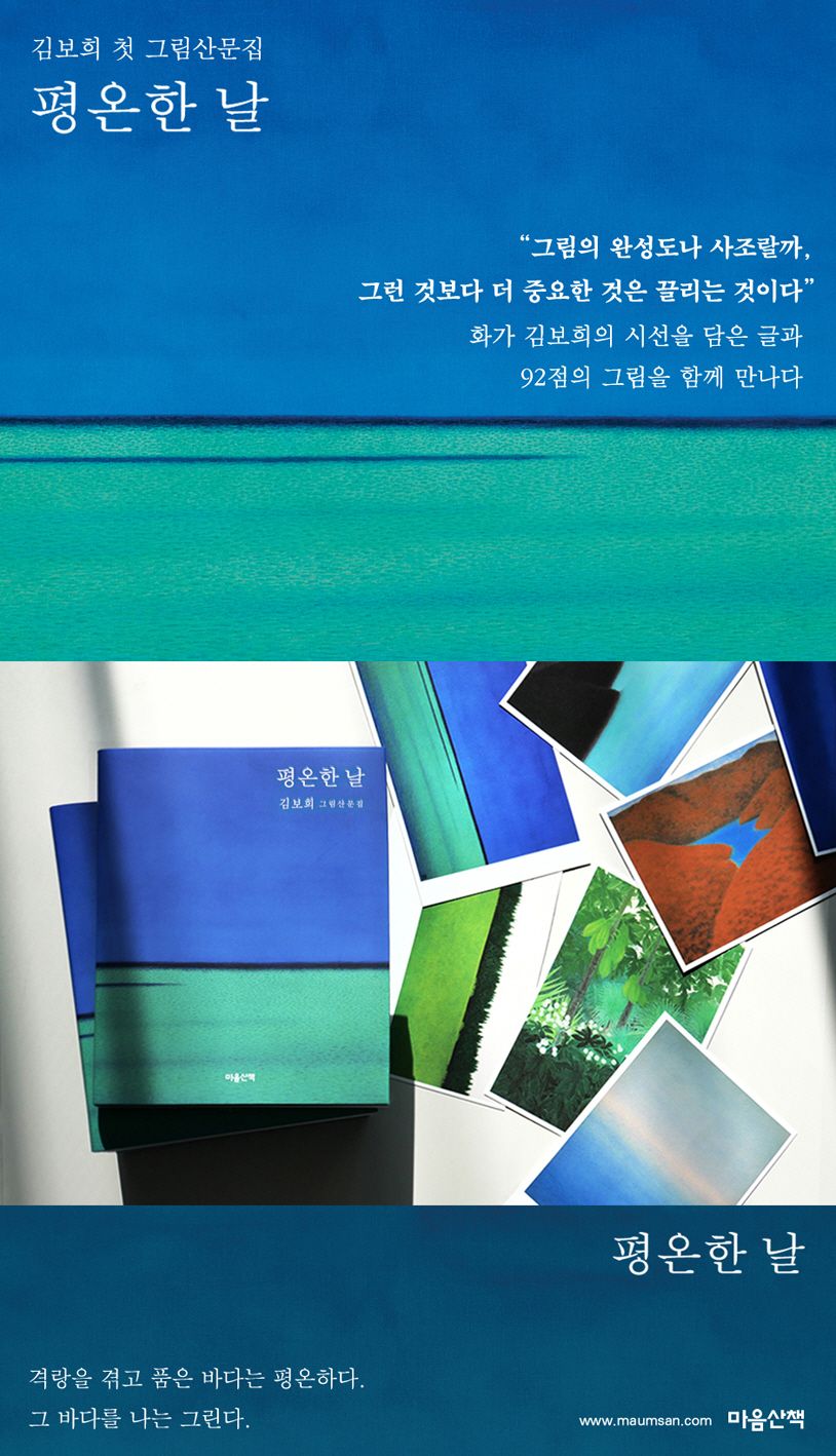 24년간 이화여대 동양화과 교수로 제자를 길러낸 김보희 화가는 2003년 제주도로 내려가 정착했다. 자연이 화폭에 담기게 된 것은 자연스러운 일이다. 책에는 웅장한 자연뿐 아니라 초기의 인물화도 실려 있다. 인물들을 그렸던 당시 상황에 대한 화가의 글을 읽는 것은 신선한 즐거움이다. 보는 이들의 마음을 늘 평온하게 물들이는 김보희의 작품들과 함께 그의 삶을 이루어온 것들을 이해하게 되는 글을 통해 제목처럼 ‘평온한 날’의 의미를 되새겨볼 수 있다.