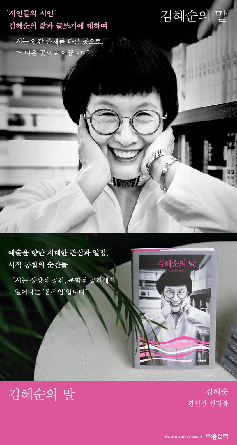 40년 넘는 시력으로 한국 현대시의 저변을 넓혀온 김혜순 시인의 인터뷰집 『김혜순의 말』이 출간되었다. 황인찬 시인이 인터뷰어로 참여하여 2022년 1월부터 7월까지 서면으로 주고받은 대화를 묶은 책이다. 시란 무엇이고 시인이란 무엇이어야 하는지뿐 아니라 삶과 예술에 대한 폭넓은 사유를 두 시인의 밀도 높은 언어로 담고 있다. 육체성과 타자성, 죽음과 고통, 가족과 시대의 억압, 여성으로서의 글쓰기 등 김혜순의 작품 세계에서 도드라지는 주제 의식들을 그의 생애와 겹쳐 살펴볼 수 있는 유일한 책이기도 하다.