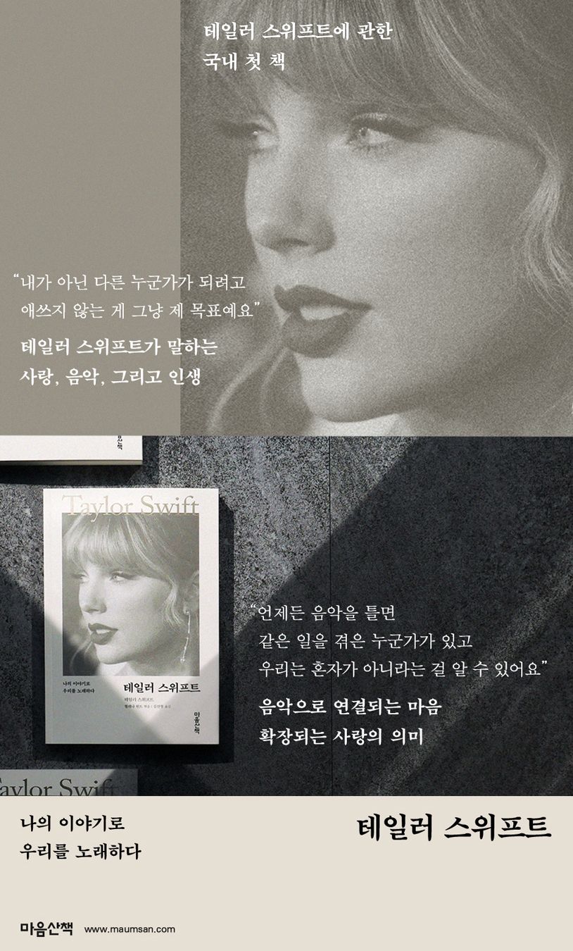 테일러 스위프트가 데뷔 때부터 지금까지 남긴 말들, 『테일러 스위프트』가 출간되었다. 스위프트와 관련하여 소개되는 국내 첫 책으로, 그가 아티스트로서 성장하는 과정뿐 아니라 여러 논란과 어려움을 딛고 자신만의 서사를 구축해가는 모습이 생생한 육성과 함께 담겨 있다.