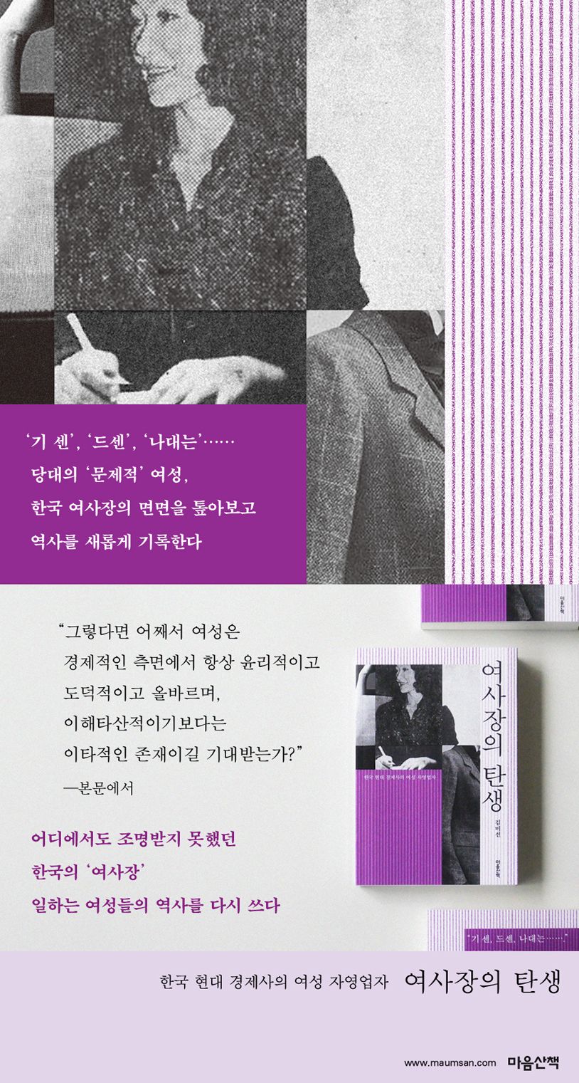 또한 저자는 여사장을 다룬 당대의 신문 기사, 영화, 소설을 분석하며 시대의 의식과 무의식을 독해해나간다. 개인의 기억이 담긴 목소리와 사회 분위기가 반영된 문화적 사료를 두루 살펴봄으로써, 이전에 기록되지 못했던 ‘여사장’의 안팎을 역사화한다.
