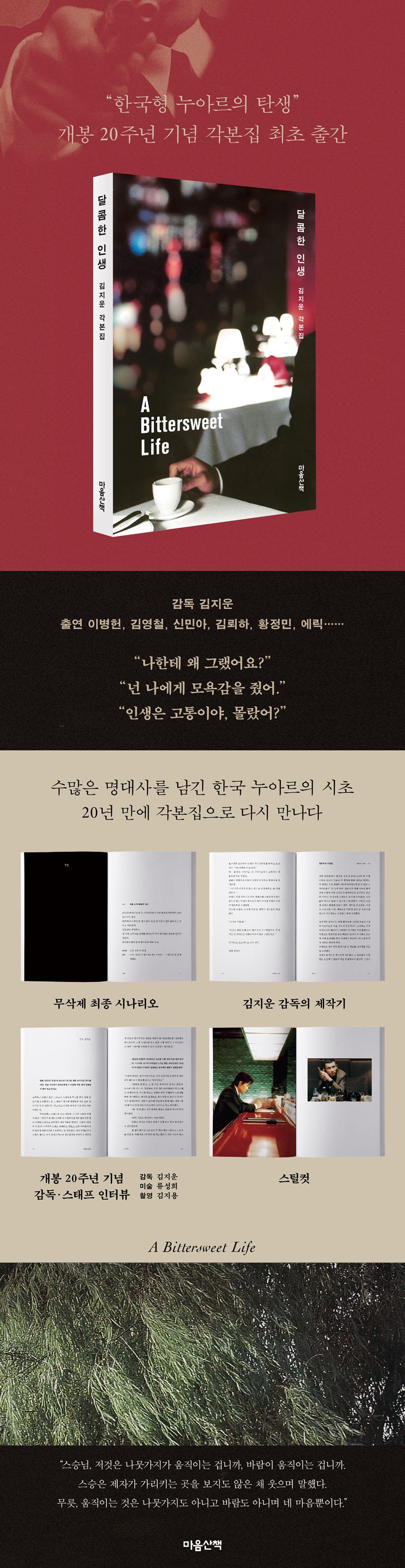 각본집 『달콤한 인생』에는 촬영 전 최종 시나리오가 수록되어 영화에 포함되지 않은 장면까지 만나볼 수 있다. 가령, 자신이 몸담던 조직에서 하루아침에 내쳐진 선우(이병헌 분)가 한밤중 강 사장(이영철 분)의 집에 찾아가는 대목은 각본집을 통해 비로소 눈앞에 그려진다. 각본과 영화를 비교하며 감독이 어디에 강세를 두려고 했으며 어떤 기준으로 최종본을 완성해나갔는지 그 과정을 쫓아볼 수 있음은 물론, 영화에 다 담지 못한 장면들로 영화 속 인물과 상황을 더 잘 이해할 수 있다. 여기에 더해 영화 개봉 20년이 지난 후 이루어진 감독·스태프 인터뷰는 〈달콤한 인생〉이라는 작품을 창작자의 시각에서 더 깊이 들여다볼 수 있는 기회를 마련해준다.