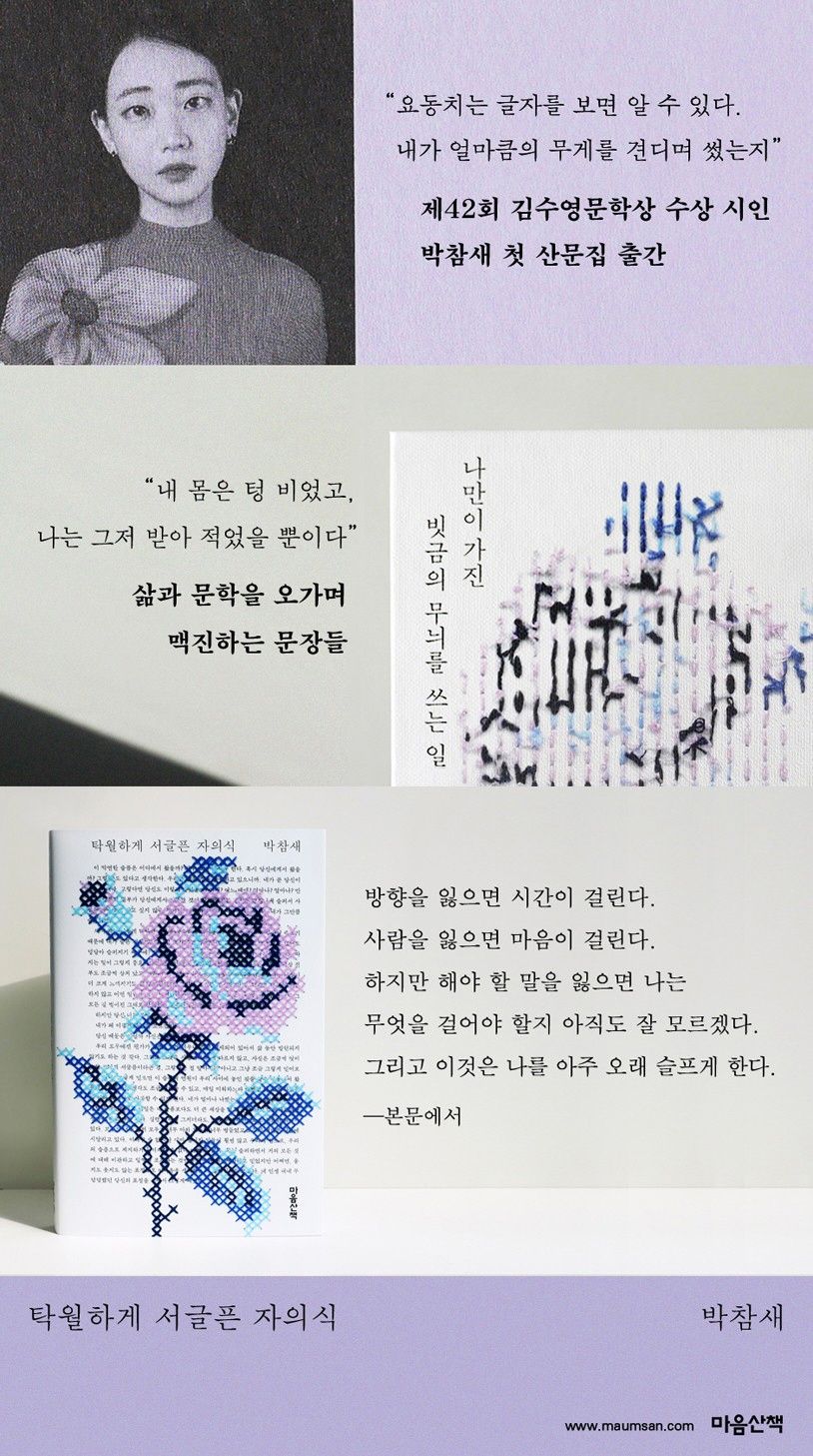 제42회 김수영문학상을 수상한 첫 시집 『정신머리』에서 첨예한 시적 감각을 보여준 시인 박참새의 첫 산문집이 출간되었다. 『탁월하게 서글픈 자의식』은 시인이 오랜 시간 응축해온 “활화산처럼 들끓는 에너지”를 시집에 분출한 뒤 처음 선보이는 단독 신작이다. 책에는 수상과 시집 출간 이후 쏟아진 온갖 종류의 관심, 그럼에도 여전한 생활의 고단함, 사회 현안에 대해 침묵하며 느끼는 수치심, 자고 떨고 울면서 보내는 무딘 나날, 스스로를 지켜줄 유일한 장치인 책으로의 도피 등 젊은 시인의 초상이 면면이 아로새겨져 있다.