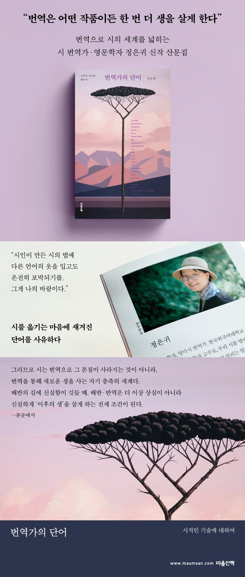 노벨문학상 수상 시인 루이즈 글릭의 시 전집, 앤 섹스턴, 윌리엄 칼로스 윌리엄스, 캐시 박 홍 등 영미 시인들의 시를 우리말로, 심보선, 이성복, 강은교, 황인찬 등 한국 시인들의 시를 영어로 옮겨온 영문학자 정은귀의 신작 『번역가의 단어』가 출간되었다. 『번역가의 단어』는 『딸기 따러 가자』(2022)와 『나를 기쁘게 하는 색깔』(2023)에 이어 마음산책에서 펴내는 정은귀의 세 번째 산문집이다.