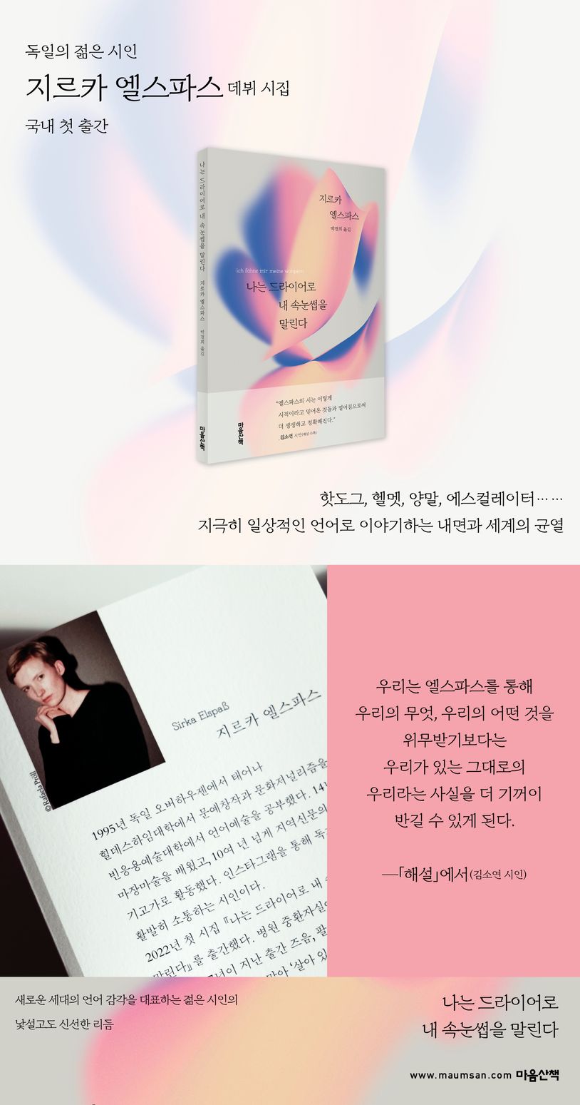 언어를 공부하고 견디면서 발명하듯 시를 쓰는 시인이 있다. 독일-오스트리아를 오가며 언어와 문학을 배우고, 2022년 첫 시집 『나는 드라이어로 내 속눈썹을 말린다』를 출간한 지르카 엘스파스다. 시집은 출간 직후 오스트리아 도서상 신인 부문 최종 후보에 올랐고, 2024년에는 독일 비스바덴에서 젊은 시인에게 수여하는 오르필 시문학상 데뷔 부문에 선정되며 독일어권 문학계에 신선한 활기를 불어넣었다. 현재 엘스파스는 시 독자층 확산에 기여하면서 새로운 세대의 언어 감각을 대표하는 시인으로 주목받고 있다.