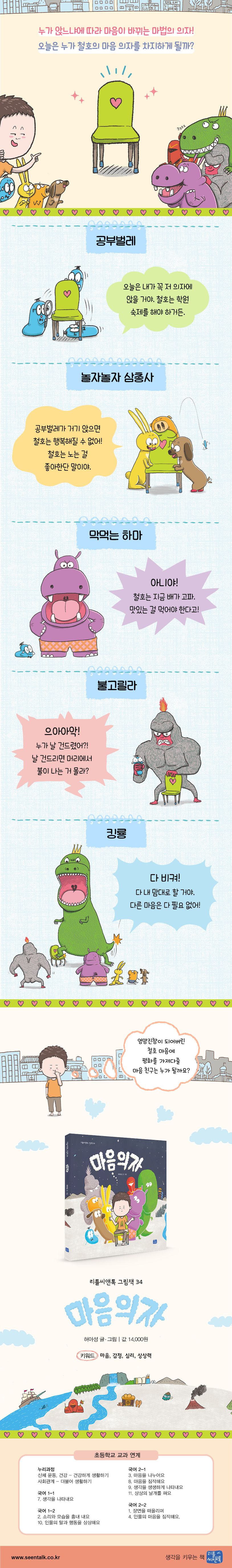 오늘따라 학원도 가기 싫고 숙제도 하기 싫은 철호. 배는 고프고 휴대폰을 떨어뜨려 짜증도 납니다. 공부벌레, 놀자놀자 삼총사, 불고릴라, 킹룡, 영웅 가면……, 이 중에 누가 마음 의자를 차지해야 철호가 행복해질까요?