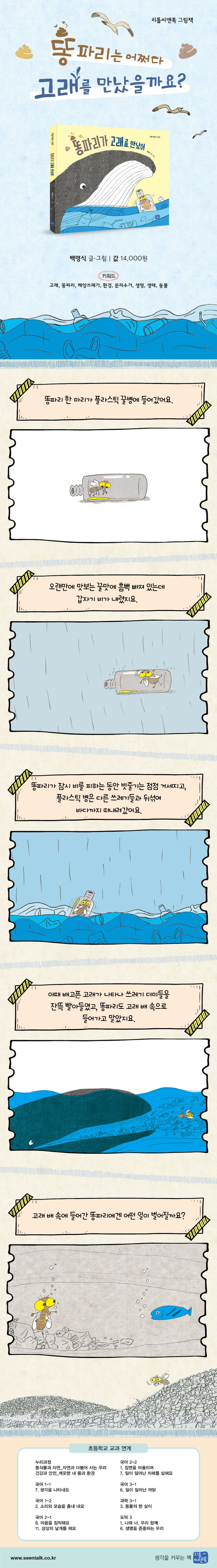 이때 배고픈 고래가 나타나 쓰레기 더미들을 잔뜩 빨아들였고, 똥파리도 고래 배 속으로 들어가고 말았지요. 고래 배 속에 들어간 똥파리는 무사할 수 있을지, 쓰레기를 잔뜩 먹게 된 고래의 운명은 어떻게 될지, 호기심을 가지고 똥파리의 모험을 따라가다 보면 똥파리와 고래를 위해 인간이 꼭 지켜야 할 것이 무엇인지 알게 됩니다.