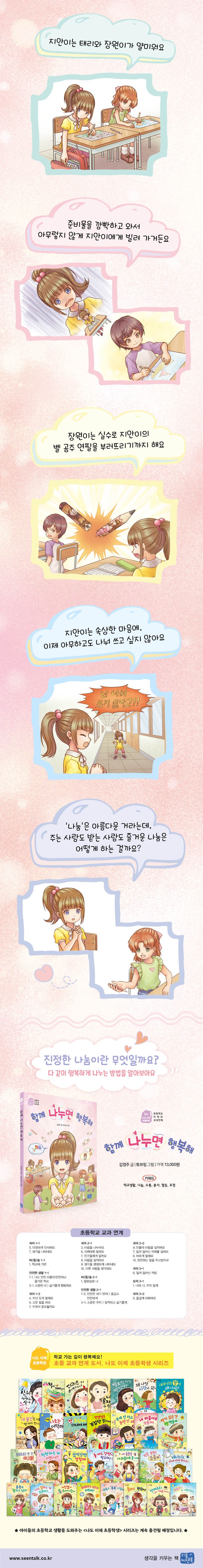 ‘나도 이제 초등학생’ 시리즈 30권. 나눔, 양보, 배려는 더불어 살아가는 데 중요한 덕목이지만, 학교생활을 이제 막 시작한 아이들에게는 실천하기 어려운 일일 수 있다. 특히 나눔은 억지로 한다고 되는 게 아니라, 마음에서 우러나와야 하는 일이다. 이 책에서는 남에게 내 것을 나누는 마음은 어떻게 생겨나는지, 다른 사람의 호의를 좋게 받아들이기 위해선 어떻게 해야 하는지, 또 나눔의 대상은 무엇인지를 깊이 생각할 수 있다.