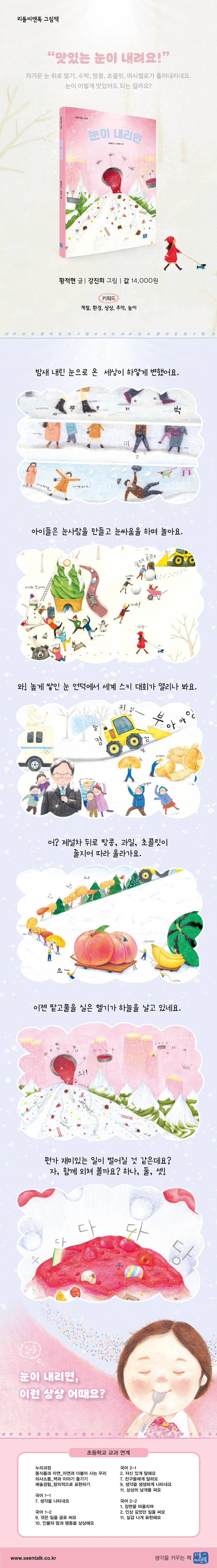 한밤중에 내린 눈 때문에 새벽부터 사람들의 발걸음이 바쁘네요. 눈이 내리면 세상은 어떻게 변할까요? 잠깐만요! 지금 스키 대회가 열리고 있나 봐요. 스키 선수들이 산처럼 쌓인 눈 위를 질주하고 있어요. 이게 어떻게 된 거죠? 하얀 눈 위로 딸기, 수박, 땅콩, 초콜릿, 마시멜로, 팥고물이 흘러내리기 시작해요. 마치 빙수처럼 알록달록하네요. 눈이 이렇게 맛있어도 되는 걸까요? 세상에 눈이 내리면 과연 어떤 일이 벌어질까요?