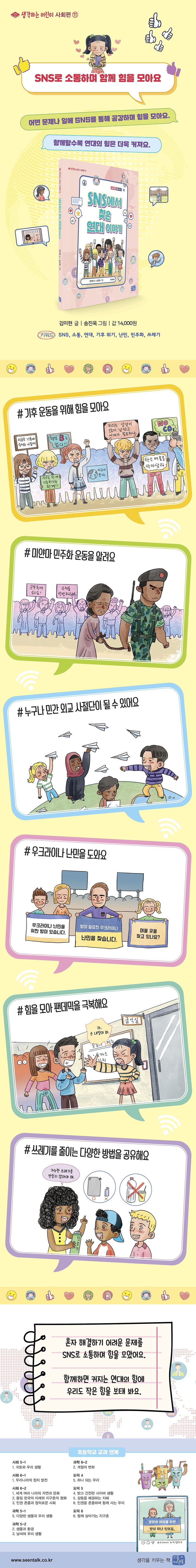 생각하는 어린이 사회편 11권. 우리는 SNS를 통해서 친구와 가족뿐만 아니라 실제로 만나 적이 없는 사람과도 소통하며 살고 있다. 서로의 일상과 생각을 공유하며 공감하기도 하고 다양한 의견을 주고받는다. 그러면서 세계적인 문제에 함께 뜻을 모으고 행동으로 이어지기도 한다. 기후 문제나 난민, 팬데믹, 쓰레기 문제 등 한 개인이 해결할 수 없는 문제에 세계인이 힘을 모으고 서로 지지하고 작은 일도 실천하면서 조금씩 변하고 바꿔 나가고 있다. 함께 할수록 커지는 연대의 힘을 알아보자.