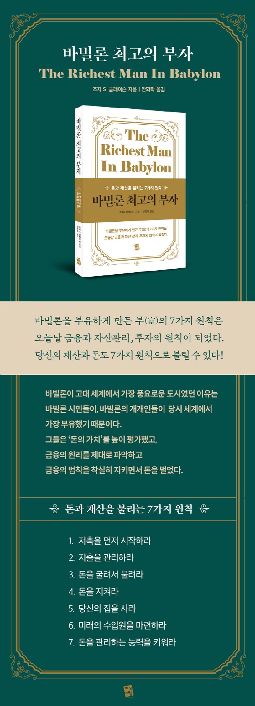 당시 바빌론 최고 부자 아카드가 들려주는 ‘돈에 관한 지혜’는 오늘날 자산 관리와 운용, 금융의 기본 원리가 되었다. 미국의 금융과 보험, 투자사들은 교과서처럼 이 책에서 말한 ‘돈 버는 지혜’ ‘돈을 지키는 지혜’ ‘돈으로 더 큰 돈을 버는 지혜’를 실천하고 있다.