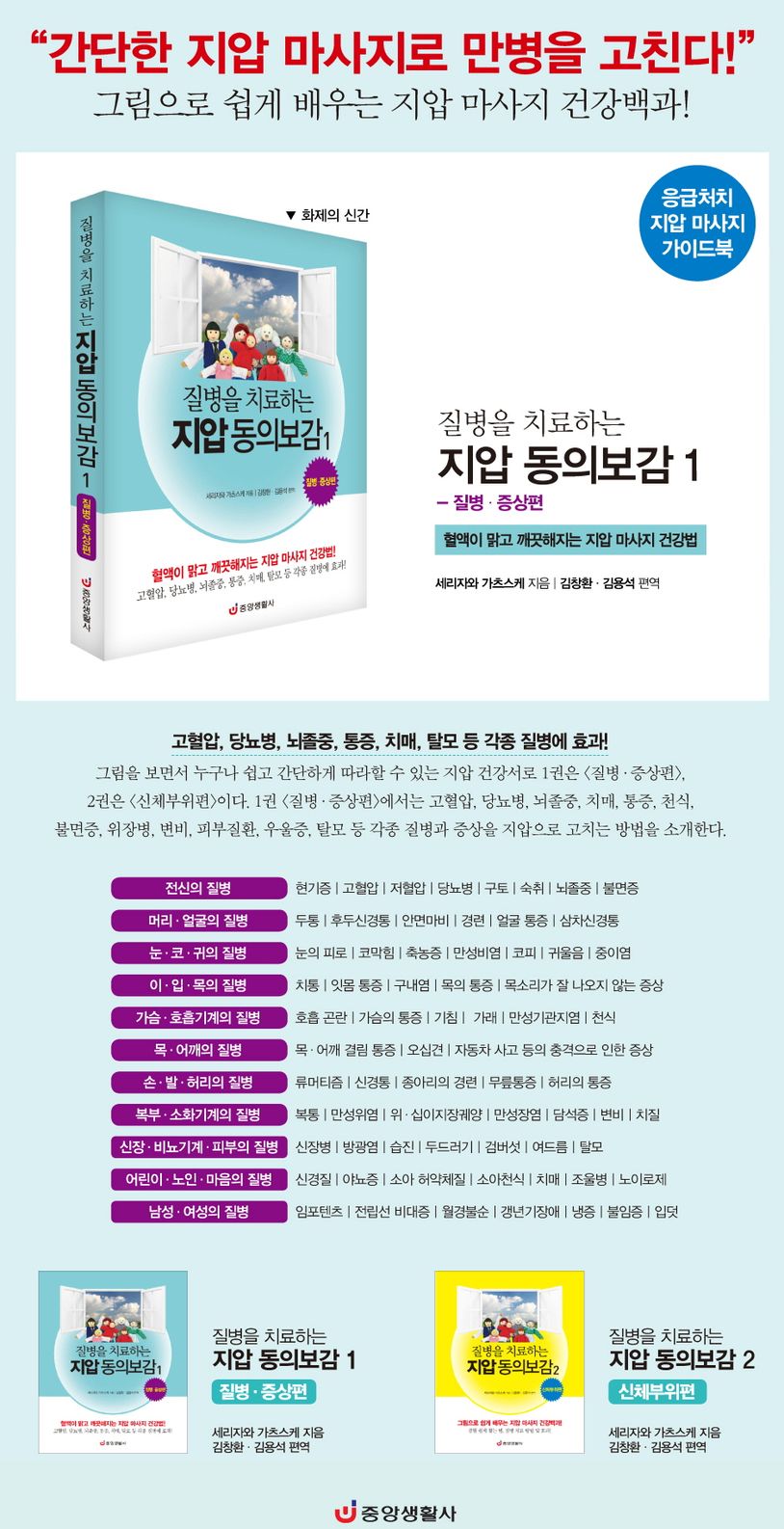 1권 〈질병·증상편〉에서는 고혈압, 당뇨병, 뇌졸중, 치매, 통증, 천식, 불면증, 위장병, 변비, 피부질환, 우울증, 탈모 등 각종 질병과 증상을 지압으로 고치는 방법을 소개한다.