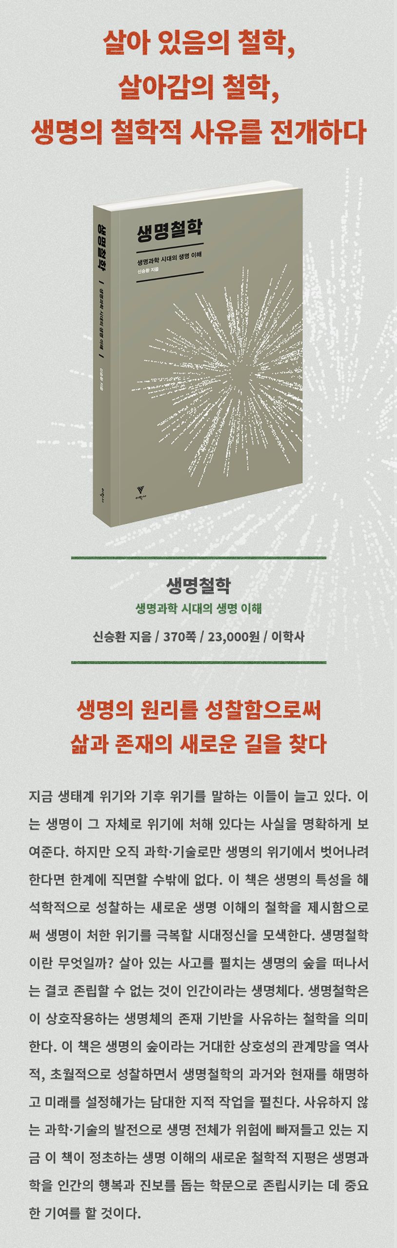 생명의 위기는 이중적이다. 한쪽에는 생태계가 파괴되는 위험이, 또는 엄청난 힘으로 삶을 좌지우지하는 생명과학과 기술의 위험이 있다. 다른 한쪽에는 우리가 어디로 가야 할지, 생명이 어디에 자리하고 있는지를 모르는 존재론적 의미의 위험이 있다. 앞의 위험이 자연적, 사회적이라면 뒤의 위험은 정신적, 철학적이다. 그러기에 오직 과학·기술로만 이런 위험에서 벗어나려 한다면 한계에 직면할 수밖에 없다. 이런 한계를 극복하기 위해 지은이는 생명이 지닌 존재론적 의미와 지향성을 올바르게 드러낼 수 있는 생명철학의 개념을 제안한다. 생명 담론을 지식체계를 넘어 학문의 한 형태로 정립하고 생명철학의 해석학적 지평을 정초해야 한다는 것이다.