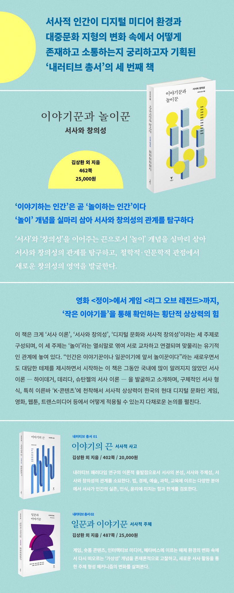 이 책은 서사적 인간이 디지털 미디어 환경과 대중문화 지형의 변화 속에서 어떻게 존재하고 소통하는지 궁리하고자 기획된 ‘내러티브 총서’의 세 번째 책이다. ‘서사적 사고’를 주제로 한 내러티브 총서 1권 『이야기의 끈』과 ‘서사적 주체’를 주제로 한 내러티브 총서 2권 『일꾼과 이야기꾼』에 이어 ‘서사와 창의성’을 주제로 한 내러티브 총서 3권 『이야기꾼과 놀이꾼』은 ‘서사’와 ‘창의성’을 이어주는 끈으로서 ‘놀이’ 개념을 실마리 삼아 서사와 창의성의 관계를 탐구하고, 철학적ㆍ인문학적 관점에서 새로운 창의성의 영역을 발굴한다. 또한 서사적 상상력이 한국의 현대 디지털 문화인 게임, 영화, 웹툰, 트랜스미디어 등에서 어떻게 적용될 수 있는지 다채로운 논의를 펼친다.