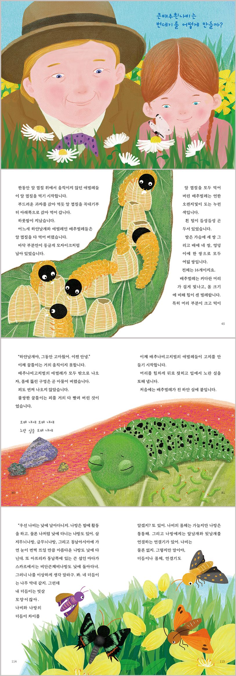 열림원어린이 〈파브르 곤충기〉 제6권에서는 큰배추흰나비의 이야기가 펼쳐집니다. 큰배추흰나비 하얀날개의 시점으로 펼쳐지는 동화를 읽으며 나비의 생생한 이야기를 들을 수 있습니다. 하얀날개의 삶은 알에서 깨어나는 것부터 애벌레, 번데기, 그리고 나비가 되어 알을 낳기까지 모든 순간이 항상 위험으로 가득합니다. 벌, 사마귀, 새, 거미, 심지어 배추벌레를 싫어하는 인간 또한 나비의 천적이지요. 사랑하는 엄마의 말을 항상 생각하며 수많은 위험과 역경을 이겨낸 하얀날개의 이야기를 읽고, 아이들은 모든 생명체는 자신만의 살아가는 방식이 있다는 생태의 다양성을 배울 수 있습니다. 우리 주변에 흔한 곤충들의 이야기에 푹 빠진 아이들은 자연환경과 다양한 동식물의 중요성, 생명의 소중함, 더불어 살아가는 세상의 의미를 깨닫게 될 것입니다.