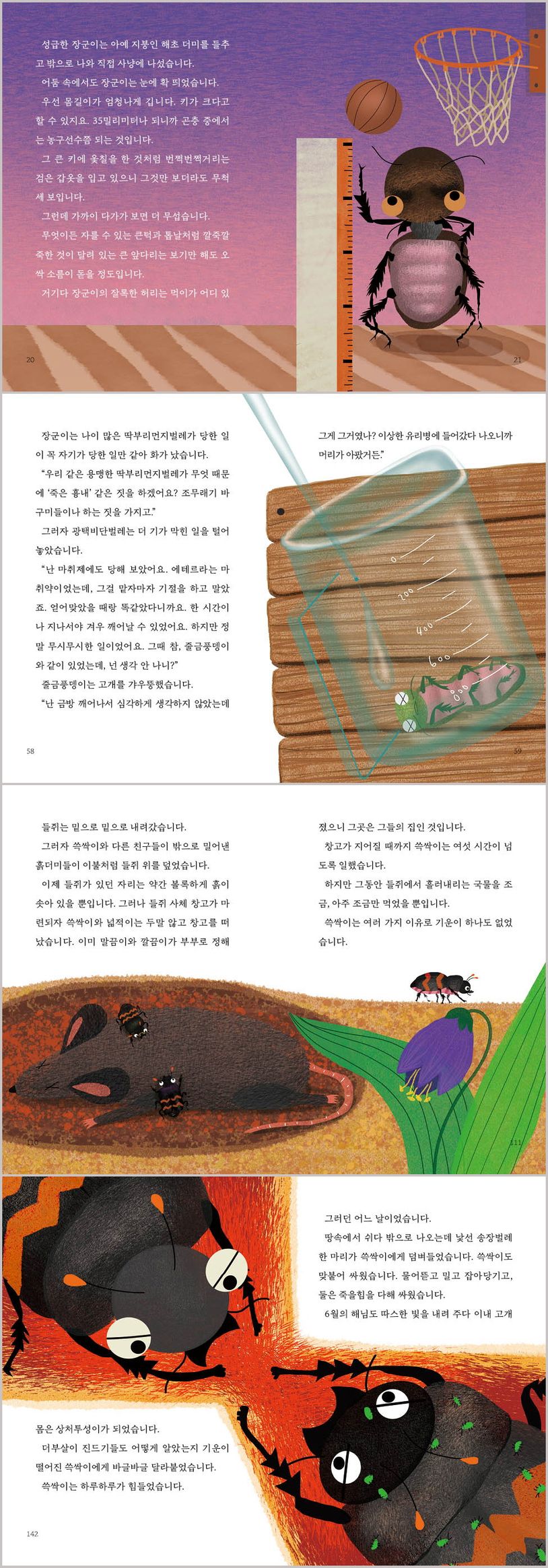 열림원어린이 〈파브르 곤충기〉 제7권에서는 죽은 동물들의 사체를 처리하는 청소부 벌레들의 이야기가 펼쳐집니다. 곤봉 모양의 특이한 더듬이를 가진 송장벌레 싹싹이는 죽은 동물이 썩는 냄새를 좋아합니다. 사람이나 다른 동물들에게는 볼쾌하기만 한 그 냄새가 청소부 동물들에게는 뿌리칠 수 없는 향기이고 영양분이라고 해요. 싹싹이는 죽은 두더지를 청소하다가 사랑하는 쓱싹이를 만나 결혼합니다. 이렇게 청소 일을 하다가 결혼하면, 그 두더지의 몸은 이들이 낳는 아기들의 소중한 식량이 되지요. 자기 몸보다 훨씬 커다란 동물의 몸을 어떻게 옮기고 처리하는 것일까요? 자연의 신비란 정말 위대한데요. 어린이들은 파브르와 손녀 루시와 함께 여행하듯 이야기 속으로 빨려 들어갈 수밖에 없습니다. 생생한 곤충들의 이야기를 읽으며 생태계의 비밀을 알고, 자연을 구성하는 요소들이 얼마나 완벽히 기능하는지 감탄할 것입니다.