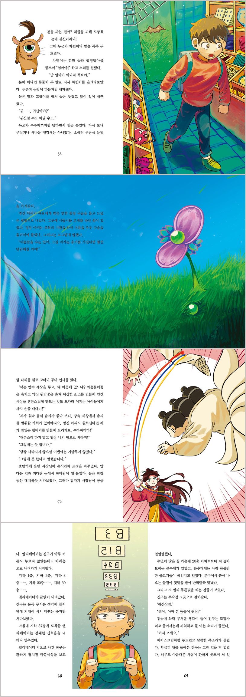 K-신화가 만든 판타지 동화 《지하 37층 귀신상점》이 새로운 모습으로 개업합니다. 끝없이 내려가던 엘리베이터 문이 열리고, 기묘한 꽃이 가득한 꽃밭을 지나면 ‘귀신상점’이 나타납니다. 그곳에서는 주인 ‘명진 아씨’와 외눈박이 안내자 ‘목요’가 손님들을 맞이하지요. 진열대에는 버드나무 호각 목걸이, 복주머니 키 링, 인어기름 틴트 등 기묘한 물건들이 놓여 있습니다. 다시 열린 귀신상점에서는 물건값을 오직 어린이의 웃음으로만 받습니다. 눈물로 물건값을 받던 귀신상점 첫 번째 이야기가 반성과 깨달음을 내세웠다면, 이번 이야기에서는 기쁨이말로 한 인격체가 성장하는 데 얼마나 큰 자양분인지 보여 줍니다. 웃음이 색색깔 구슬이 되고, 마침내 시든 꽃을 되살리는 장면은 독자의 마음에 깊은 여운을 남기지요. 한편, 학교 앞 ‘미스터햄’은 특별 소스와 육즙 흐르는 패티의 햄버거, 아이돌 같이 멋진 사장님의 인기 때문에 늘 손님으로 북적이는데요. 깊은 밤, 미스터햄의 사장님이 인두겁(인간의 거죽)을 벗으면 머리가 셋에 꼬리가 아홉 달린 요괴가 본모습을 드러냅니다. 그는 사실 지하 37층 귀신상점의 꽃밭에서 ‘싸움붙이꽃’과 ‘악심원망꽃’을 훔쳐 내는 삼두구미입니다. 훔친 꽃으로 정체 모를 소스를 만들고, 지상의 햄버거 가게 사장으로 둔갑해 아이들을 유인해 오던 것입니다. 그러나 어린이들이 위기에 빠진 순간, 용감한 명진 아씨가 등장합니다. 긴장감 넘치는 결투 장면은 어린이 독자들에게 손에 땀을 쥐게 하는 재미를 선사할 것입니다. 자, 이제 판타지 급행 엘리베이터에 탑승하세요. 《인두겁을 쓴 삼두구미가 출몰하는 지하 37층 귀신상점 2》로 여러분을 데려갈 것입니다.