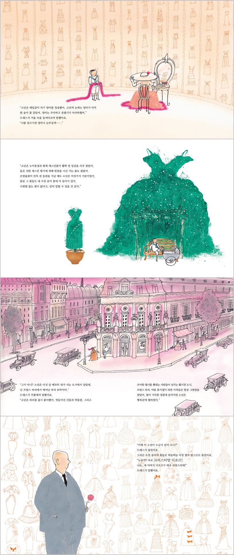 여러분은 ‘Dior(디올)’이라는 이름을 아시나요? 고급 의상이나 화장품에 관심이 적더라도, 일상 속에서 아마 한 번쯤은 들어 보셨을 거예요. 우리의 삶 곳곳에 자리한 그 이름의 주인공은 여성의 아름다움을 예술로 표현한 디자이너, 크리스티앙 디오르입니다. 1947년 그는 패션하우스 ‘디올’을 세우며, ‘뉴룩(New Look)’이라 불리는 새로운 여성복의 시대를 열었습니다. 그의 디자인은 지금도 전 세계 사람들이 사랑하는 스타일의 상징으로 남아 있지요 그러나 크리스티앙의 디자인이 처음부터 화려하고 유명했던 건 아니에요. 시작은 아주 소박했습니다. 꽃을 사랑하던 소년의 시선, 바로 거기서부터였습니다. 프랑스 바닷가 마을 그랑빌의 분홍빛 집, 엄마의 드레스 자락, 정원의 장미와 재스민 향기, 누이동생과 함께 걷던 들판, 그리고 파리의 하늘빛까지. 그가 바라보던 모든 장면이 훗날 ‘디올’의 드레스 속에 살아 숨 쉬게 된 것입니다. 《디오르의 수천 송이 꽃》은 한 소년이 아름다움을 느끼고 표현하는 예술가로 자라나는 과정을 보여 주는 성장기입니다. 나아가 화자인 드레스가 이야기를 들려주면서, ‘아름다움을 보는 마음’이 어떻게 예술이 되는지 자연스럽게 전합니다. 언제라도 책장을 열면 디자이너 크리스티앙 디오르의 어린 시절과 그의 작품 세계를 엿볼 수 있을 것입니다.