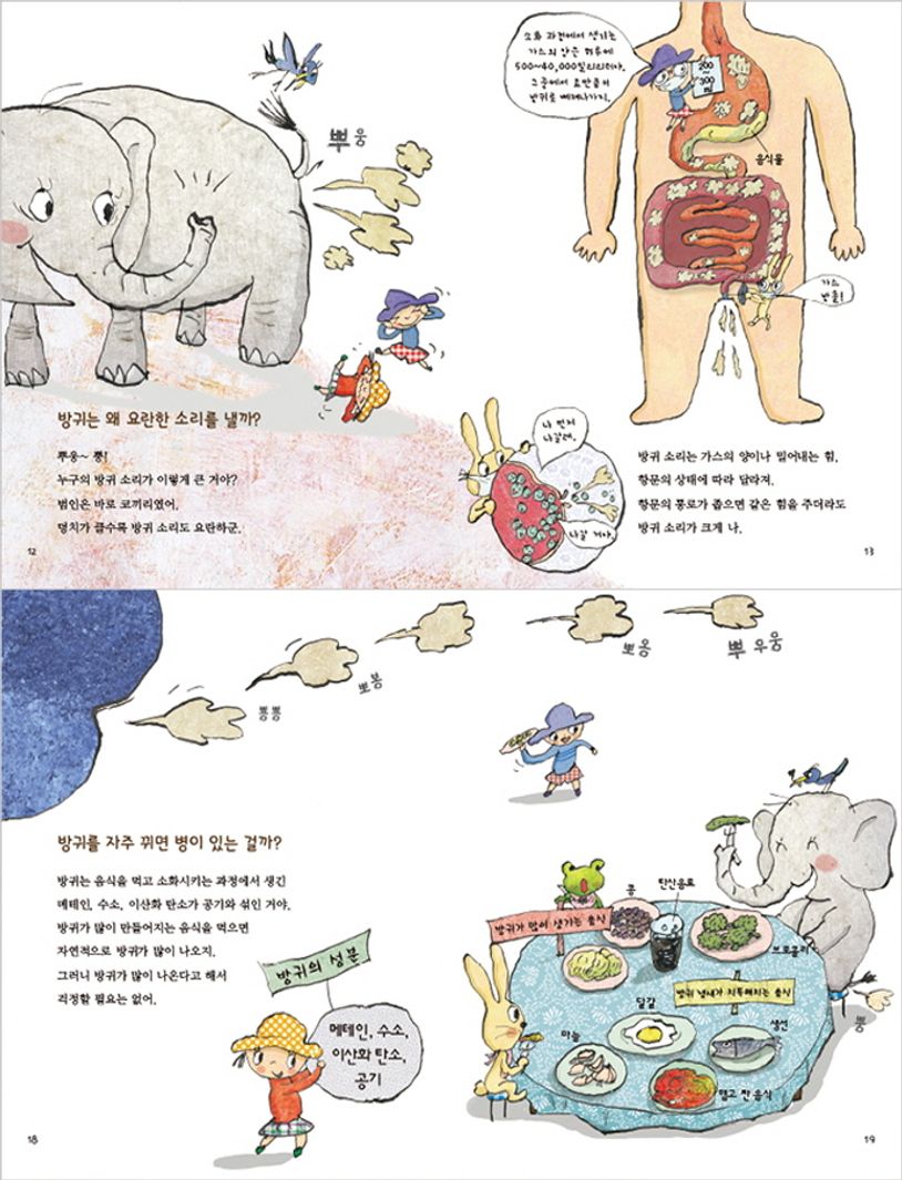우리 몸에서 나는 냄새에 관해 다룬 과학 그림책『냄새 나는 책』 제1권 방귀 편. 분비물이 생성되고 배출되는 인체의 순환과 소화 구조 등 기본적인 과학 지식과 함께, 동물들의 분비물과 배설물, 생리 현상에 관한 문화적 지식, 배설물과 지구 환경, 대체 에너지 등 다양한 관점에서 주제를 고찰합니다. 방귀 편에서는 방귀 냄새는 왜 구릿한지, 방귀는 무엇으로 이루어져 있는지 등 방귀를 낱낱이 분석합니다. 방귀에 관한 여러 가지 궁금증을 풀어 나가며 방귀가 우리에게 왜 소중한지 생각해 볼 수 있습니다.