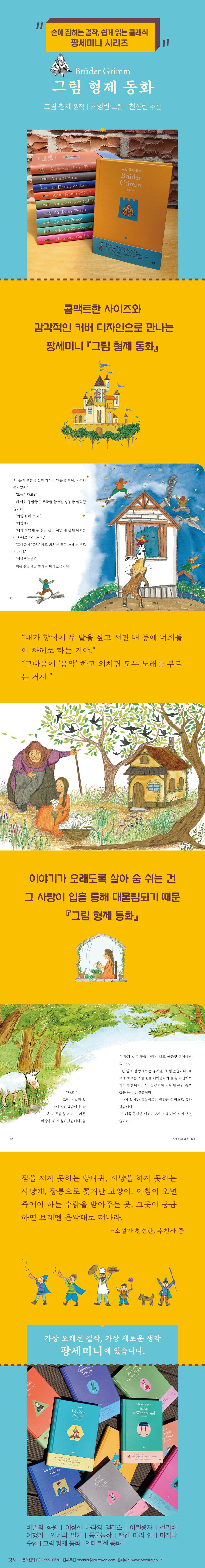 그림 형제(Br?der Grimm)는 정치적, 사회적인 혼란기를 살며 민족의 언어와 정체성을 지키고자, 입에서 입으로 전해지는 노래나 이야기를 모아 언어가 어떻게 달라져 왔는지 학문적으로 살펴보고자 했다. 그리고 몇 년에 걸쳐 모은 이야기들을 정리해 1812년 『어린이와 가정을 위한 동화집』을 출간하는데 그것이 바로 지금의 『그림 형제 동화』이다. 이 책은 단순한 동화 이상의 가치를 가졌다고 평가받는데, 독일 설화 문학을 탄생시켰다는 데 가장 큰 의미가 있다. 형제의 원본은 2005년 유네스코가 지정하는 세계 기록 유산에 등재되었고 지금도 전 세계 언어로 번역되어 출간되고 있다. 그림 형제의 동화가 시대를 초월하고 인종과 국가를 불문하여 지속적으로 사랑받고 회자되는 이유는 무엇일까? 그 이야기 속에 바로 우리 인생을 관통하는 지혜가 담겨 있기 때문이다. 이렇게 오랫동안 지속된 클래식의 가치를 지키며 현대적 감성에 맞도록 재구성하여, 이 시대의 어린이들이 함께 즐기도록 다듬었다.