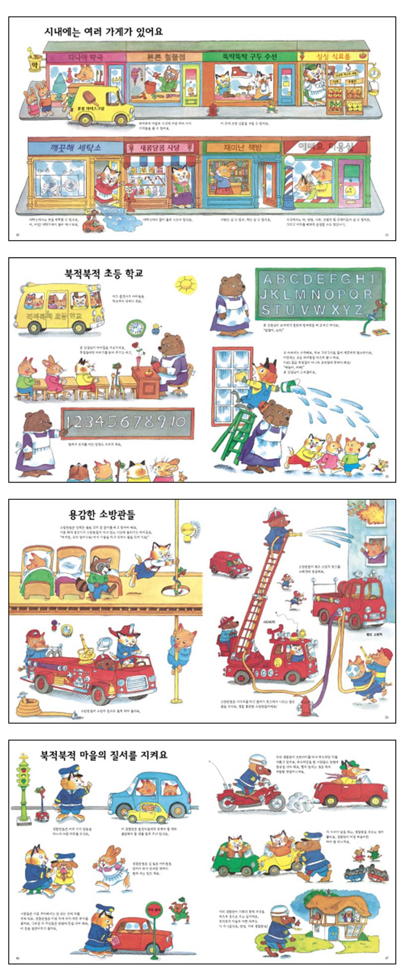 '리처드 스캐리 보물창고' 시리즈, 제3권 『북적북적 우리 동네가 좋아』. 이 시리즈는 30여 년간 활동하면서 300여 권의 그림책을 펴내 30여 나라에서 사랑받아온, 그림책 작가 리처드 스캐리의 익살과 유머가 가득 담긴 그림책으로 이루어져 있습니다.