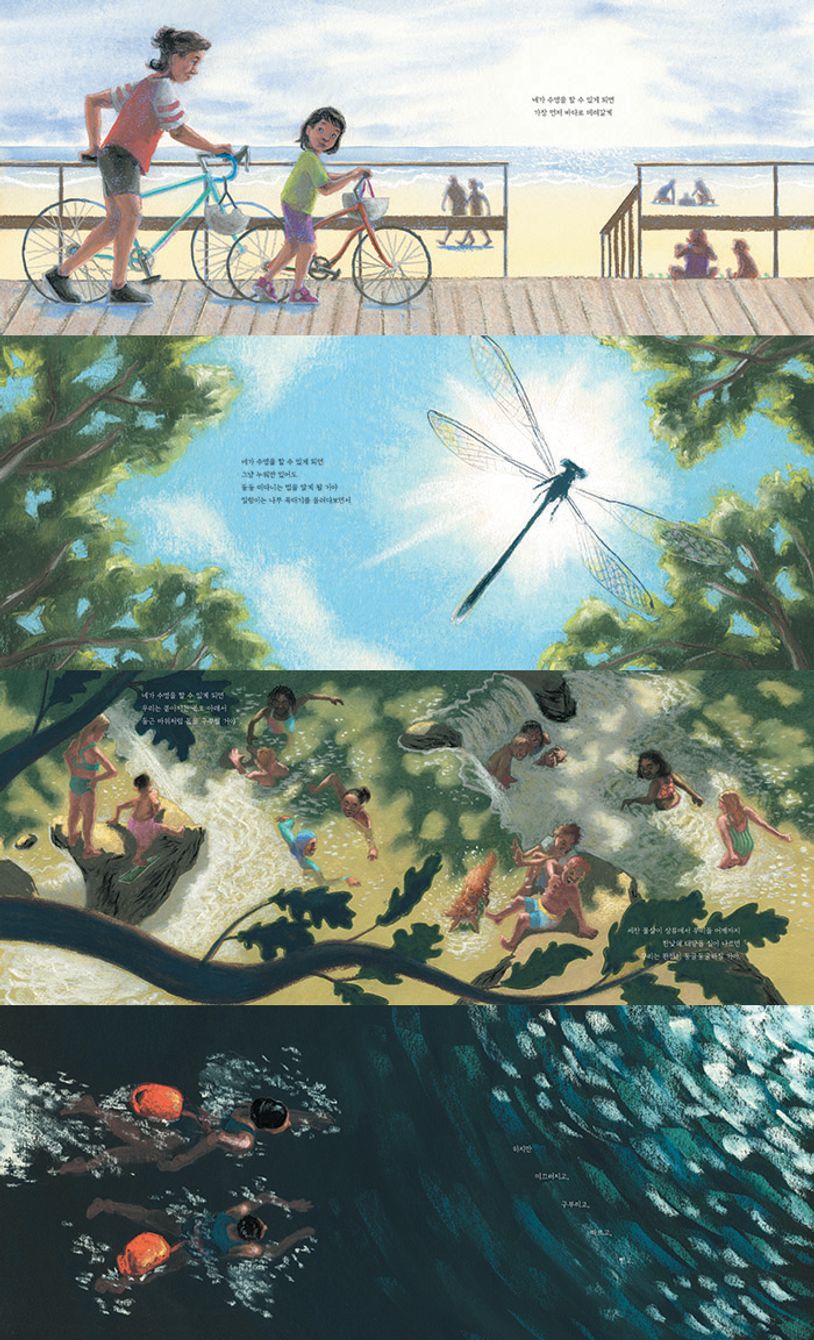 『수영을 할 수 있게 되면』은 시적인 그림책이다. “네가 수영을 할 수 있게 되면”이라는 문장이 매 장마다 시처럼 반복되며 운율을 만들고 다양한 장소와 인물들의 이야기가 연작시처럼 모여 있다. 『수영을 할 수 있게 되면』의 아름다운 일러스트와 시적인 문장들을 따라가다 보면 어느새 수영에 대한 두려움은 설렘으로 바뀌어 있을 것이다.