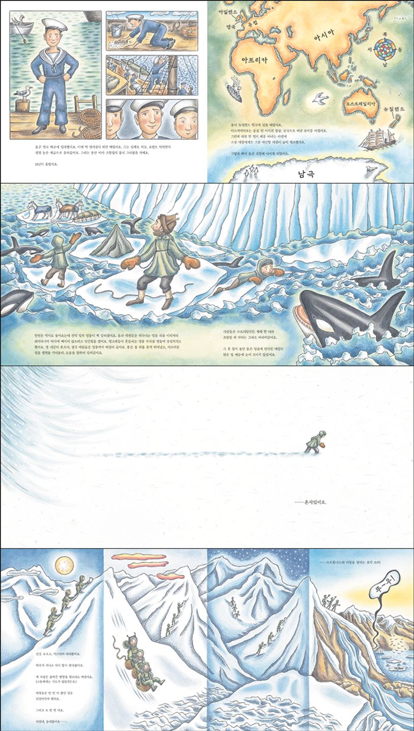 『남극 탐험의 영웅 톰 크린』의 작가 제니퍼 썸스는 남극 대륙의 거대함과 아름다움, 곳곳에 도사린 위험을 제한적인 색채에도 불구하고 탁월하게 재현했다. 세밀하면서도 알기 쉽게 묘사된 남극 대륙의 모습을 통해 톰 크린의 여정이 어떤 길을 거쳐 갔을지 상상할 수 있다.