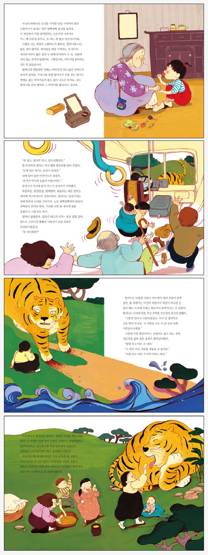 할아버지의 할머니인 노할머니의 치맛자락에는 이야기가 가득 담긴 주머니가 숨겨져 있다. 오늘은 노할머니가 고갯길에서 호랑이를 만난 이야기를 들려주셨다. 노할머니는 결혼한 딸이 아이를 낳는다고 해서 늦둥이 아들을 업은 채 쌀 두 말을 이고 딸네 집으로 가고 있었다. 우연히 버스를 만나 보리개떡을 주고는 올라타게 되었다. 그런데 버스가 고갯길을 넘던 중에 갑자기 멈추고 말았다. 배고픈 호랑이가 나타난 것이다. 호랑이는 자신의 배를 채울 한 사람을 내놓으라고 버텼다. 사람들은 신발 한 짝씩을 던져 호랑이에게 직접 고르라고 했다. 그런데 호랑이가 노할머니의 신발을 고르고 말았는데……. 그림 작가 최정인의 생동감과 역동성이 넘실대는 익살스러운 그림을 함께 담아 아이들의 오감을 자극한다.