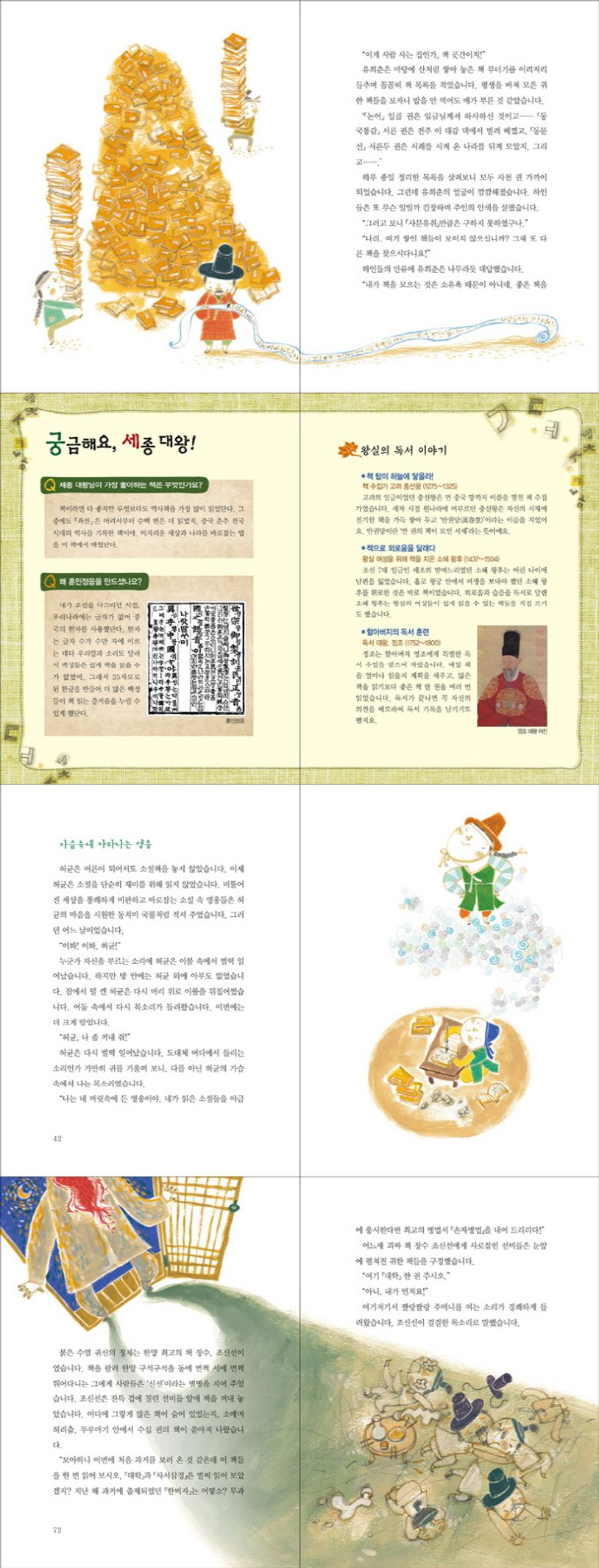 책 병이 나도 손에서 책을 놓지 않았던 세자에서 한글을 발명한 위대한 왕이 되었던 세종대왕, ‘여자애가 책은 읽어서 뭐해?’라는 편견을 딛고 일어선 예술가이자 현명한 어머니였던 신사임당, 조선 시대 한양 최고의 책 사냥꾼으로 불렸던 책 애호가 유희춘, 소설과 사랑에 빠진 소년 허균, 동네 바보에서 최고의 시인으로 거듭난 김득신, 서얼 출신이지만 책 전문가로 벼슬길에 올랐던 이덕무, 조선에서 가장 유명했던 책장수 조신선, 아들들을 위해 유배지에서도 글을 썼던 정약용, 감옥에서도 죄수들을 가르치며 독립 운동을 했던 김구의 이야기를 만날 수 있다.