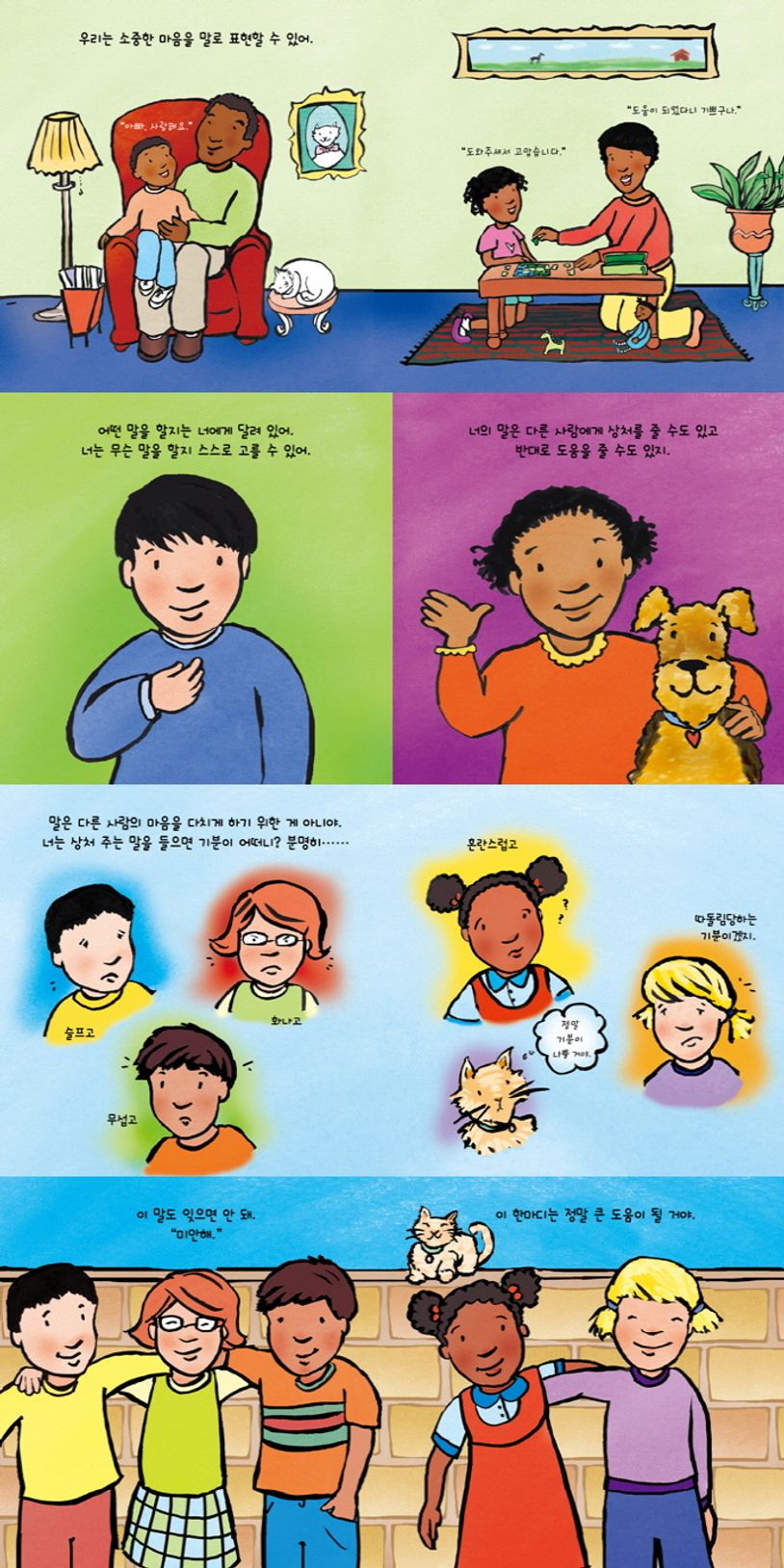 바른 언어 습관을 함양하기 위한 첫걸음이 되어 줄 그림책 『마음에 상처 주는 말』. ‘다른 사람을 배려하는 언어 습관 기르기’라는 부제를 달고, 인성교육의 주요 과제 중 하나인 ‘말조심’에 대한 이야기를 담고 있다. 상당히 직설적인 제목은 ‘내가 하는 말이 남에게 상처를 줄 수도 있다’는 사실을 인식하는 것이 이 책의 시작점임을 알린다. 이제 막 ‘말’로써 사회적 관계를 맺어 가는 아이들에게 말이란 단순히 발화하고 끝나는 것이 아니라 상대방의 마음에 파장을 미친다는 걸 알려주고자 한다. 이 그림책을 통해 아이들은 평소 자신의 언어 습관에 대해 스스로 돌아볼 수 있을 것이며, 궁극적으로는 말이란 다른 사람을 다치게 하는 도구가 아니라는 소중한 사실을 깨닫게 될 것이다.