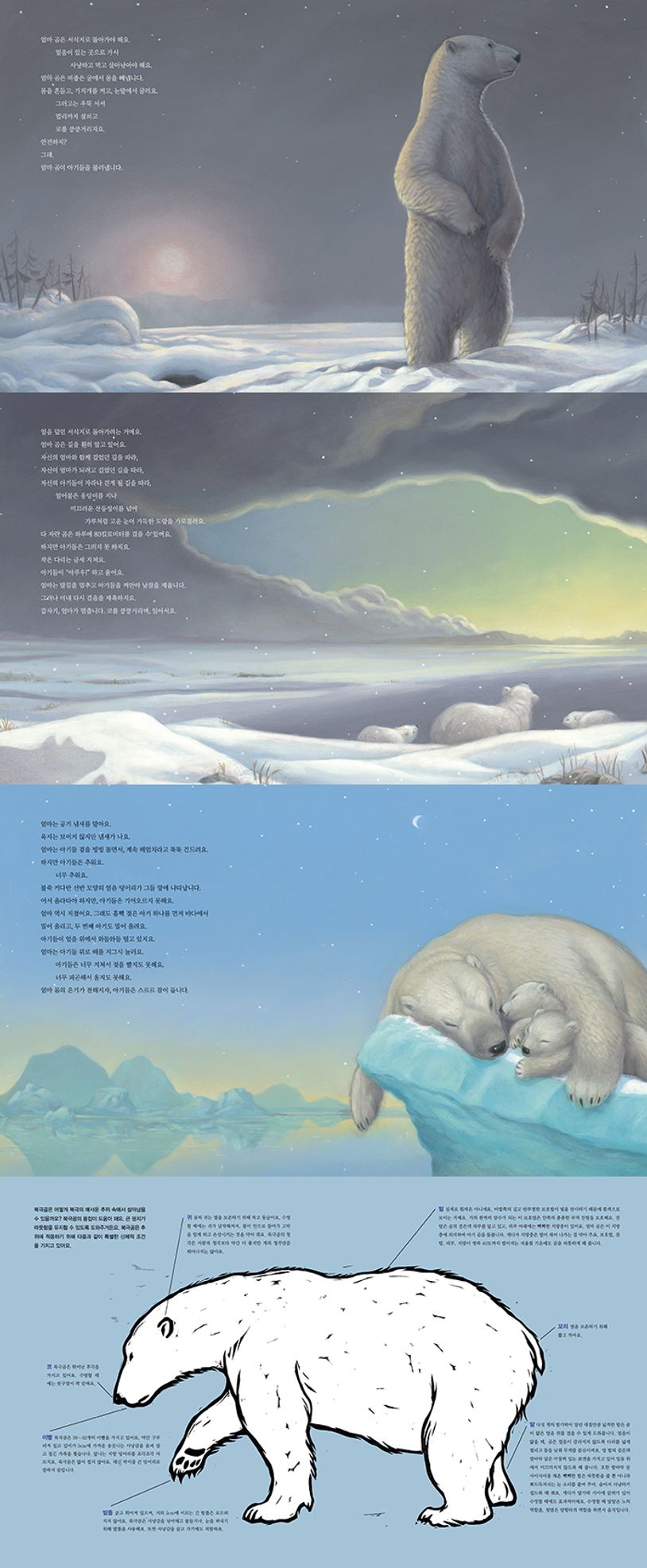 보물창고 〈지구를 살리는 그림책〉 시리즈 14번으로 출간된 『북극곰 살아남다』는 아기 북극곰이 태어나 처음 맞는 사계절을 따라가며 온난화로 인해 북극곰이 어떤 곤경에 처했는지 생생하게 묘사한다. 그림책 속 북극곰 가족 역시 BBC 다큐멘터리 속 북극곰 가족과 다르지 않다. 아기 북극곰들은 장거리 헤엄으로 울지도 못할 만큼 지치고, 엄마 곰이 해줄 수 있는 건 멈추지 말라며 아기 곰들을 툭툭 밀어 주는 것뿐이다. 그래도 그나마 운이 좋았다. 다큐멘터리 속 아기 북극곰이 끝내 살아남지 못한 것과 다르게 말이다.