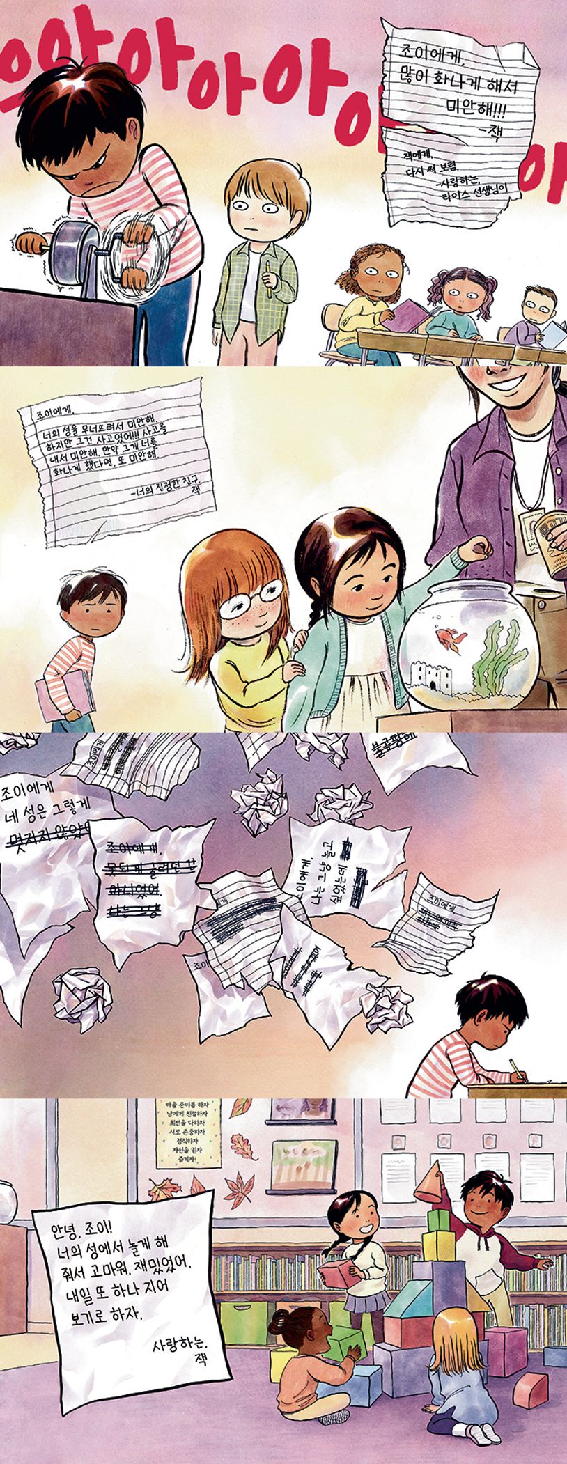 그림책 『화나게 해서 미안해』의 주인공 잭은 '미안'이라고 적힌 꼬깃꼬깃한 쪽지를 쓰레기통에 던진다. 친구가 블록으로 쌓은 성을 자신이 무너뜨렸기에 사과를 해야 한다는 건 알지만 왜인지 자존심이 허락하지 않는 모양이다. 선생님은 자꾸만 편지를 다시 쓰라고 한다. 계속해서 사과의 편지를 쓰는 동안 잭은 자신의 마음을 되돌아보며 감춰 두었던 진심을 내비치기 시작한다. 그리고 마침내 친구의 마음도 들여다 볼 수 있게 된다. 그렇게 건넨 진심어린 사과는 아이의 소중한 우정을 지킬 수 있게 해 준다. 조금씩 달라지는 잭의 사과 편지를 지켜보면서 어린이 독자는 자연스럽게 '올바른 사과의 방법'을 터득하게 될 것이다.