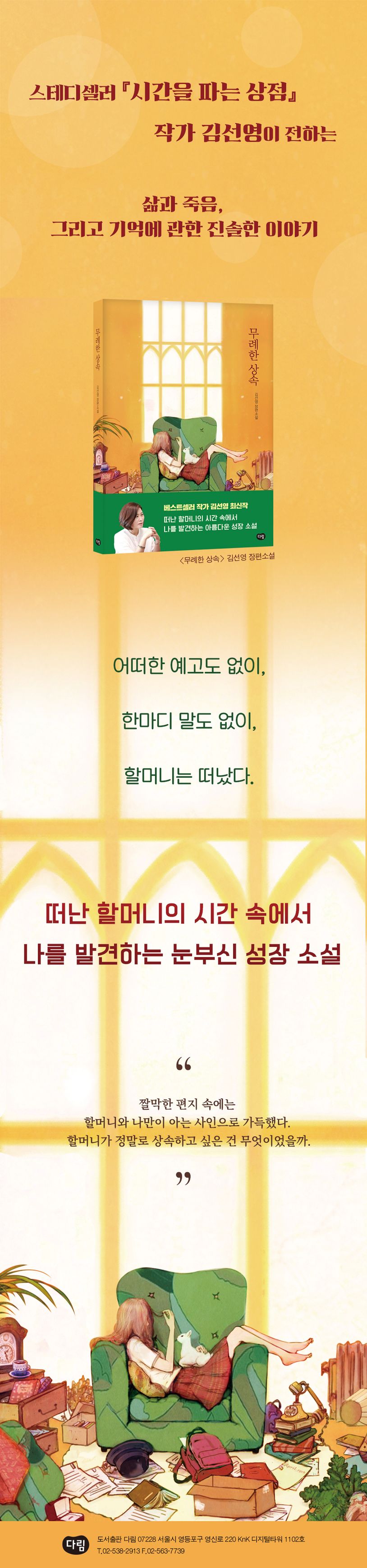 베스트셀러『시간을 파는 상점』으로 눈에 보이지 않는 것들의 가치를 이 시대의 많은 청소년에게 다시 한 번 일깨워주었던 김선영 작가가 이번에는 삶과 죽음, 그리고 기억에 관한 진솔한 이야기로 우리에게 돌아왔다.