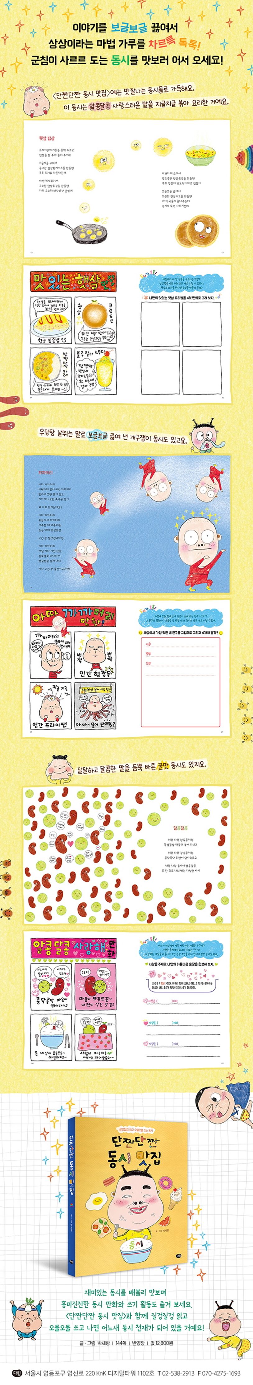 〈단짠단짠 동시 맛집〉은 〈라면 머리 아줌마〉, 〈깔깔 주스〉 등을 지은 그림책 작가이자, 시인으로 문단에서 활발한 작품 활동을 펼치고 있는 박세랑 작가가 쓰고 그려 낸 동시책이에요. 기발하고 통통 튀는 30편의 동시와 함께 재미난 쓰기 활동을 담았어요. 동시를 그냥 읽는 것이 아니라, 동시에 쓰인 다양한 표현 방법을 익히고 배울 수 있도록 구성했어요. 동시마다 흥미진진한 네 컷 만화와 다양한 쓰기 활동지를 수록해 글쓰기에 필요한 기초 체력을 키울 수 있게 해 주어요. 유튜브나 애니매이션 등 영상에 익숙한 어린이 독자들의 취향을 고려한 귀여운 일러스트 또한 풍성하게 담았답니다. 동시의 내용을 이해하는 데 도움을 주며 동시를 더욱 깊이 감상할 수 있게 해 줄 거예요.