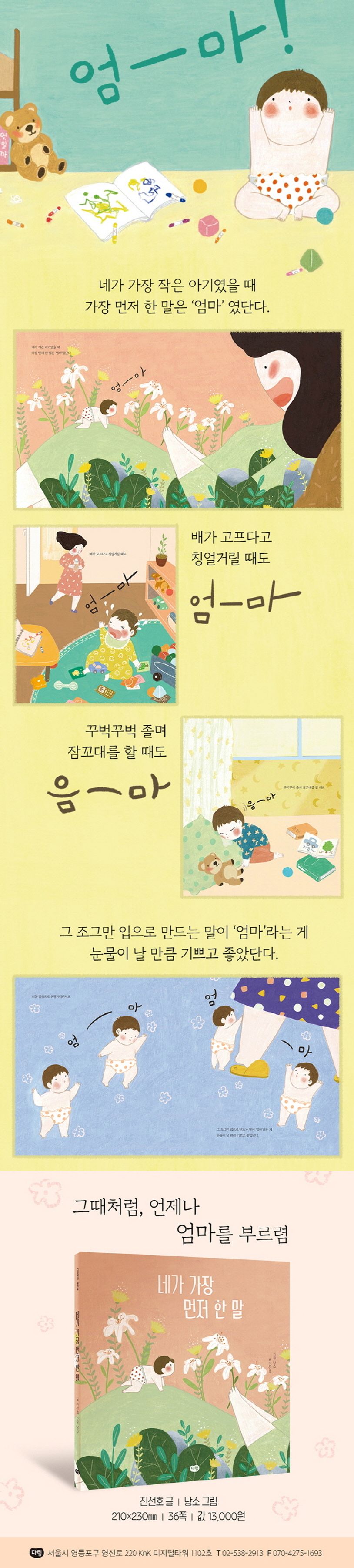 ‘그때처럼, 네가 작은 아기였을 때처럼 언제든 엄마를 부르렴.’ 이 약속의 유효기간은 아마 평생인 듯합니다. 다 큰 어른들도 깜짝 놀라거나 당황스러울 때 ‘엄마!’, ‘엄마야!’ 하고 엄마를 찾곤 하니까요. 속상하고 서러울 때 가장 먼저 생각나는 것도 엄마의 얼굴이지요. 언제나 나를 지켜주는 존재, 부르는 것만으로도 위로가 되는 든든한 이름입니다. 그러니 어여쁜 우리 아이에게도 꼭 이야기해 주세요. ‘엄마’, 그 말이 지닌 무한한 힘과 사랑을요.