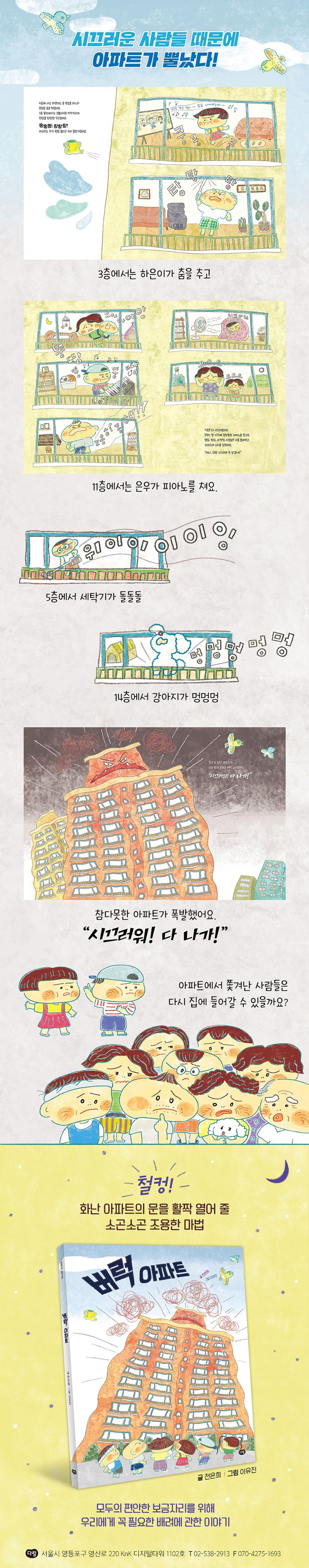 만약에 우리가 사는 아파트가 ‘시끄러워! 다 나가!’ 하고 소리친다면 어떻게 해야 할까요? 아침부터 밤까지 하루 종일 시끄럽게 하는 사람들 때문에 아파트는 한숨도 잘 수 없었어요. 참다못한 아파트는 버럭 소리를 지르며 사람들을 내쫓아 버리고는 문을 쾅 닫았어요. 열쇠공이 와서 문을 열어 보려 했지만 소용없었어요. 소방관도 출동했지만 마찬가지였어요. 굳게 문을 닫은 아파트를 두고 사람들은 편을 갈라 싸우기 시작했어요. 어떻게 하면 아파트의 화가 풀릴까요? 아파트에서 쫓겨난 사람들은 다시 아파트에 들어갈 수 있을까요?