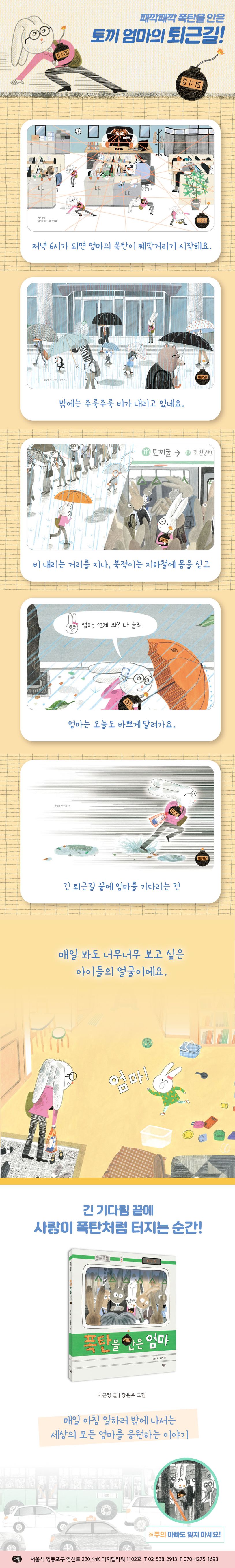 또한 폭탄은 아이에게 하는 엄마의 약속이다. 매일매일 ‘엄마 언제 와?’ 물어보는 아이들의 속마음엔 작은 불안이 자리 잡고 있다. 질문 속에 ‘엄마가 안 오면 어떡하지?’ 하는 걱정을 숨기는 아이들에게, 온갖 역경을 뚫고 집에 가는 토끼 엄마의 모습은 어떤 순간에도 엄마가 곁에 있을 거라는 믿음을 줄 것이다.
