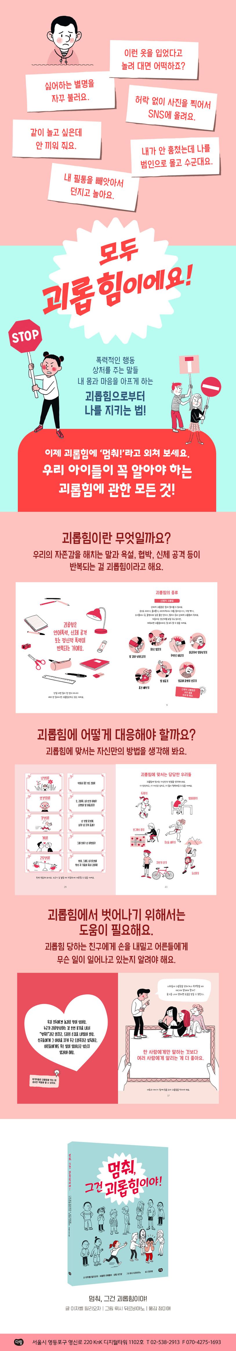 괴롭힘을 당하거나, 목격하거나 혹은 누군가를 괴롭히고 싶은 마음이 들 때 어떻게 해야 하는지 피해자와 목격자 그리고 가해자의 입장에서 살펴본 책이다. 괴롭힘은 나쁜 것이라고 경고하는 것에서 더 나아가 괴롭힘의 현장에서 아이들이 느끼는 감정에 공감하고 괴롭힘에 대응하는 구체적인 방법을 알려 준다.