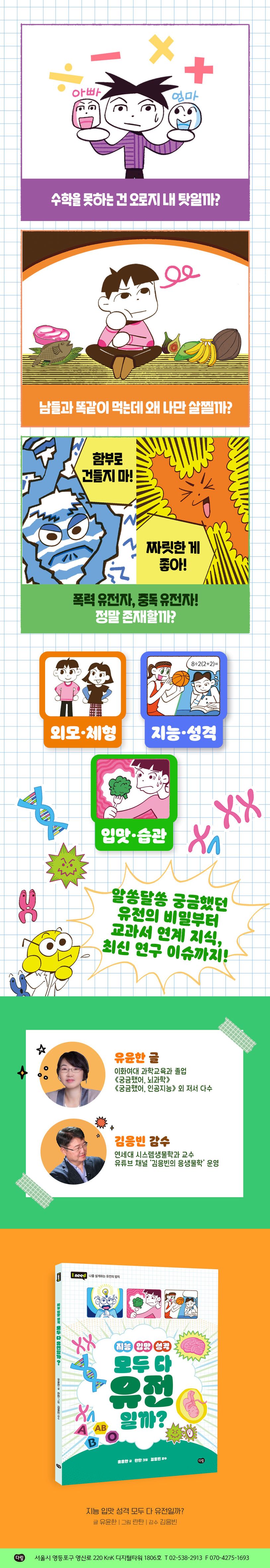 책속에서우리는모두부모님을닮지만,혈액형은그렇지않은경우가종종있어요.만일내혈액형이부모님중누구와도같지않다면,왜그런걸까요?형제나자매는부모님과혈액형이같은데나만다르다면,무언가수상하지않나요?사실나는부모님의친자식이아니었던것일까요?물론그럴수도있지요.하지만대부분은그런출생의비밀과는상관없어요.그냥철저한유전의법칙에따라부모님과는다른혈액형을갖게된것뿐이랍니다.10쪽탈모유전자는열성유전자이기때문에대립하는우성유전자(머리카락이빠지지않는정상유전자)가있으면활동하지못해요.그래서X염색체가1개뿐인아들은불리해요.엄마로부터물려받은X염색체에탈모유전자가있다해도,이것을눌러줄대립유전자를가진또하나의X염색체가없기때문이에요.아들이아빠로부터물려받은Y염색체에는탈모유전자를누를수있는우성유전자가없어요.탈모만이아니에요.Y염색체에들어있는유전자수는X염색체보다훨씬적기때문에필요한유전자를골라쓰기에아들은불리한경우가많지요.34~35쪽만약내가DRD4변이유전자를물려받은것같다면어떻게해야할까요?우선축하드려요.역사에남을모험에뛰어들자질을물려받았으니까요.그럼도박이나외도는어떻게하냐고요?우리가총알을가졌다고해서아무때나총을쏘진않는다는사실만기억하면돼요.즉,DRD4변이유전자란총알을가장적절한곳에쏘기위해주의를기울이면서좋은일에도전해보세요.어느새보통사람들은해내기어려운일에성공해있을거예요.72쪽우리몸의설계도인DNA를하나의도서관이라고상상해볼게요.이때각각의유전자는도서관의책꽂이에꽂힌책들이랍니다.그런데만일어떤책에메틸기라는스티커가붙으면,아예그책을펼칠수도없게돼요.세포들이다른곳에한눈팔지못하도록불필요한설계도는볼수도없게만든거예요.예를들어뇌세포도서관에선뇌관련설계도만읽고,엉덩이세포도서관에선엉덩이관련설계도만읽게되어있답니다.106쪽교과연계:5-2과학1.생물과환경6-2과학4.우리몸의구조와기능*인증유형:공급자적합성확인