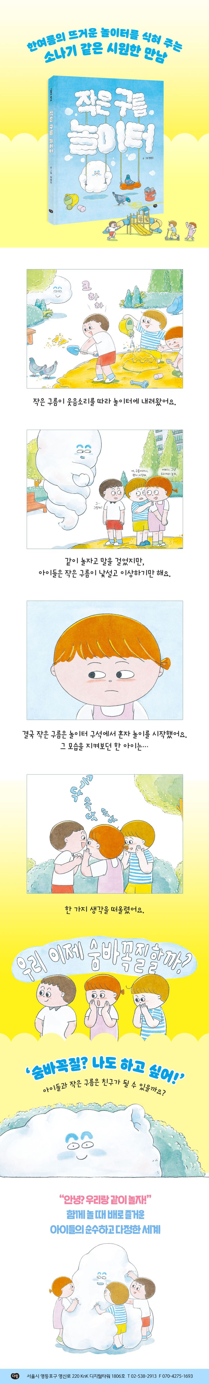 그때, 어디선가 목소리가 들려왔다. “우리 숨바꼭질할까? 열 셀 동안 숨어라!” 작은 구름은 설레는 마음으로 나무 뒤에 몸을 숨겼다. 나도 찾아 주면 좋겠다! 놀이터에 숨은 작은 구름의 하루는 어떻게 흘러갈까? 함께할 때 더 즐거운 놀이터에서 펼쳐지는 여름날의 특별한 만남을 기대해 보자.