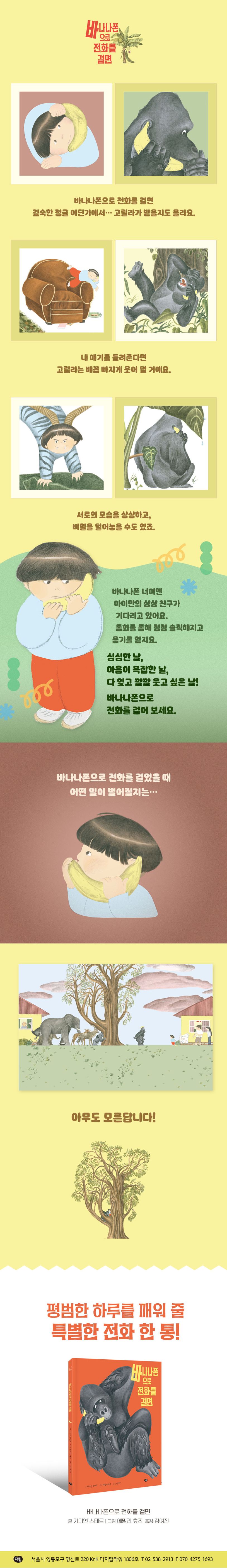유튜브도 재미없고 게임도 시시할 때, “엄마, 엄마!” “아빠, 아빠!” 불러도 대답이 없을 때, 눈을 감고 수십 마리의 양을 세어도 잠이 오지 않을 때, 누군가에게 마음을 털어놓고 싶을 때, 바나나를 귀에 대고 전화를 걸어 보세요. 깊속한 정글 어딘가에서… 고릴라가 전화를 받을지도 몰라요.