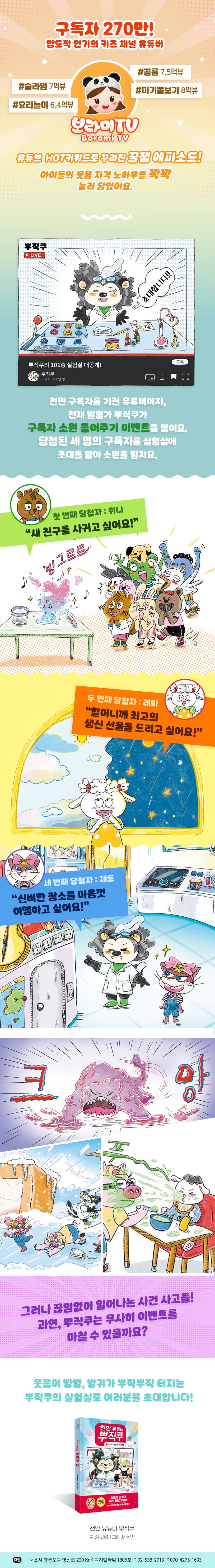 《천만 유튜버 뿌직쿠》는 현실과 상상을 자유롭게 넘나드는 유쾌한 이야기 속에 따뜻한 메시지가 녹아 있어요. 아이들의 웃음 코드를 정확히 짚어 내며, 상상력을 자극하는 장면들이 쉼 없이 이어지지요. 꾸르잼의 몸개그와 귀여운 실수, 키킥봇의 야무진 정보력, 그리고 뿌직쿠의 시원한 방귀 한 방까지! 페이지마다 웃음이 터지고 통쾌한 쾌감이 몰아칩니다. 영상보다 짜릿한 반전, 세상 모든 발명품을 뛰어넘는 상상력이 궁금하지 않나요? 뿌직쿠의 101층 실험실로 지금 바로 입장해 보아요. 뿌직!