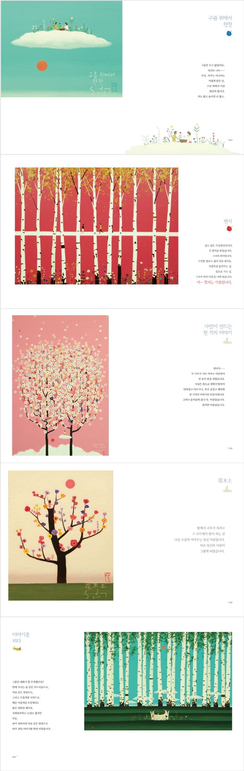 ‘나’가 아닌 ‘우리의 모습’, 특별한 날이 아닌 일상의 모습에서 행복의 조각을 찾아내는 저자의 글과 그림이 어우러지며, 그의 붓끝에서 그려지는 포근한 감성과 아늑한 행복감은 한편의 동화처럼 펼쳐진다. 때로는 수줍은 소년의 모습으로, 때로는 인생의 환희를 노래하는 어른의 안목으로 진하고 깊은 감동을 더한다.