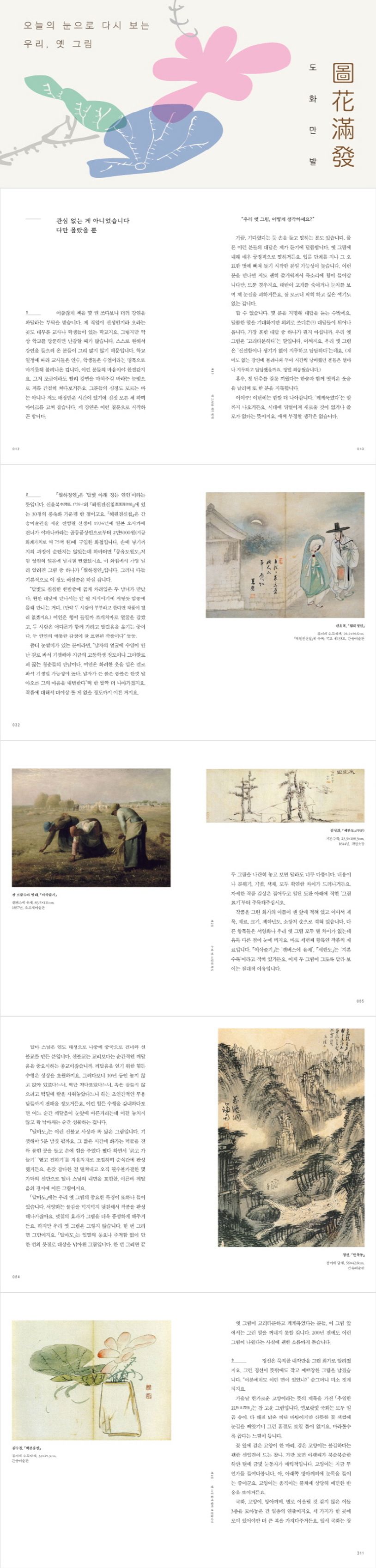 화려한 볼거리가 쏟아지는 요즘 같은 시대에 은은한 색감에 간결한 선으로 그려진 옛 그림은 다소 밋밋하고 심심하게 느껴질지도 모른다. 사정이 이러하니 무조건 ‘우리 것이 좋은 것이여!’ 하고 외칠 수도 없는 노릇. 하지만 다시금 생각해보자. 옛 그림에 대한 부정적인 생각에는 오해도 다분하지 않을까? 옛 그림에 대해 잘 몰라서 생기는 막연한 선입견은 아닐까? 어쩌면 살짝 맛만 보는 것으로 옛 그림에 대한 선입견이나 관심이 달라질지도 모를 일이다. 옛 그림을 알기 쉽게 전하는 최석조의 『도화만발』은 그런 의미에서 옛 그림 입문자들의 입맛을 돋울 상큼한 에피타이저이다.