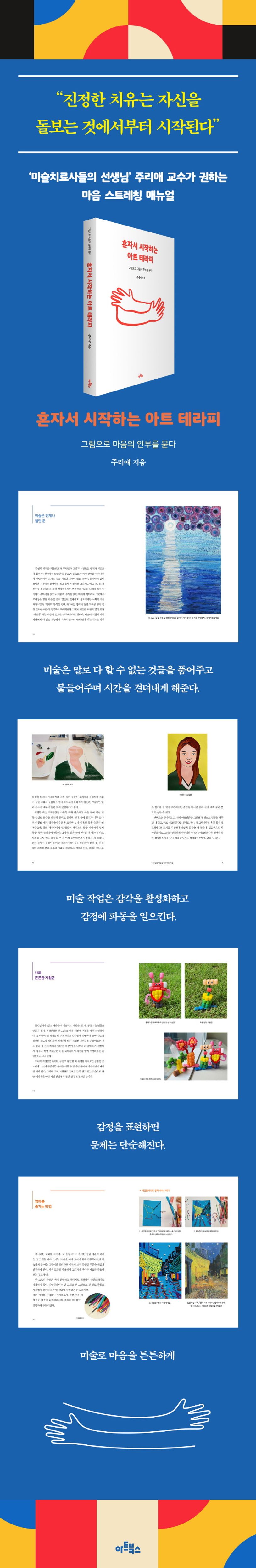 언제나 할 일은 산더미처럼 쌓여 있고, 모든 일을 끝마치면 새로운 일이 기다리고 있다. 입버릇처럼 “바쁘다, 바빠~ 현대사회”를 말하면서, 더 열심히 하지 못하는 자신을 비난하는 이야기는 더이상 남의 일이 아니다. 모두가 지쳤고, 지쳐 있는 상태가 곧 일상이 되어버렸다. 불안과 걱정, 인간관계에서 겪는 어려움, 스트레스와 우울감은 덤으로 따라온다. 여행지에서도 와이파이를 찾으며 로그인 상태를 유지하고, 몸은 회사에서 멀어졌지만 닥쳐올 업무에 마음이 불편하다. 쉬면서도 제대로 쉬지 못한다. 그 어느 때보다 휴식이 필요한 시기, ‘미술치료사들의 선생님’ 주리애 교수가 누구나 손쉽게 미술로 자신의 마음을 진단하고 치료하는 방법을 제안한다. 외부 환경에 따른 우울과 불안, 스트레스에 무너지지 않고, 미술치료를 통해 우리 안에 잠재된 회복탄력성을 깨우는 것이다. 『혼자서 시작하는 아트 테라피』는 불안한 감정이 무사히 흘러갈 수 있게 도우며, 보이지 않는 감정을 시각 이미지로 표현해 자신이 겪고 있는 문제를 명확하게 들여다볼 수 있게 안내한다.