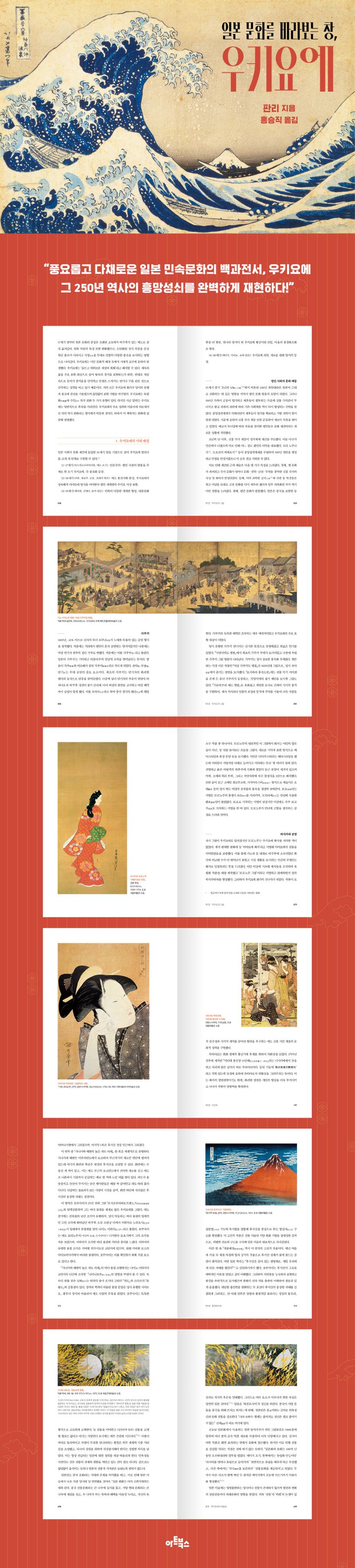 일본 민속 문화의 백과사전이라고 할 수 있는 우키요에는 에도시대(1603~1868) 민간에서 유행한 목판화로, 민간 화가의 손과 붓에서 나온 대중 예술이다. 유창한 선과 선명하고 아름다운 색깔로 당시 사회 각계각층의 온갖 생활상과 유행을 생생히 표현한 이 독특한 미술 양식은 에도시대 인물과 사회 풍속을 살펴보는 데 귀중한 자료이자 일본 문화를 이해하는 창이 되어준다. 이처럼 일본의 민족적 성격과 심미적 사유가 반영된 우키요에의 250년 역사를 중국의 일본 미술사학자가 오랜 연구 끝에 한 권의 책으로 엮었다.