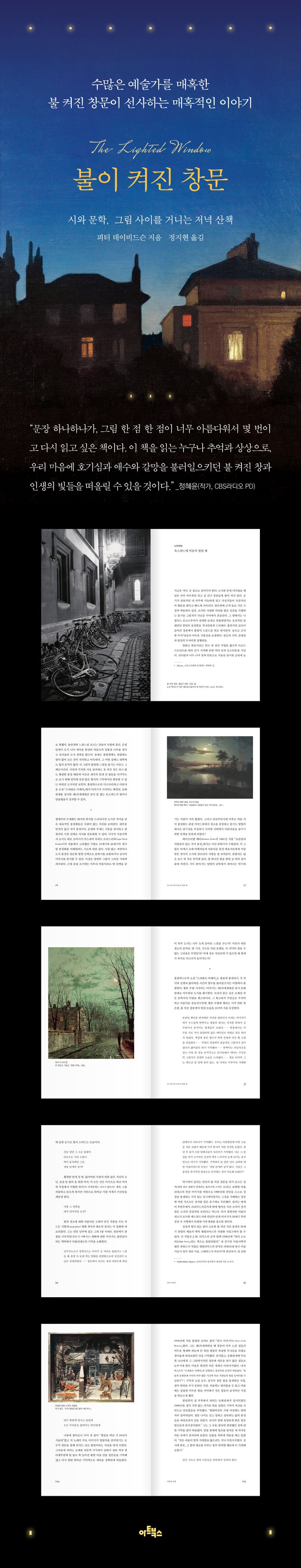 문화사학자 피터 데이비드슨이 안내자가 되어 영국과 유럽, 북미의 해가 저문 도시와 잉글랜드 시골의 들판에 난 길로 우리를 이끄는 이 독특하고 아름다운 책은 불 켜진 창문에서 풍기는 미스터리함과 유혹, 애수를 느껴본 사람이라면 누구에게나 새로운 문학적 사색의 길을 열어준다. 저자는 독자의 손을 잡고 그림으로 들어가 함께 움직이고 느낌으로써 어느덧 그림과 현실의 경계를 허문다. 책에는 초기 낭만주의 회화에서부터 현대 소설에 이르기까지 매우 광범위한 예술작품 속 어둑한 밤이 꿈결처럼 펼쳐져 있으며, 그 안에서 반짝이는 어렴풋한 불빛은 오래 전 기억, 예술적 감흥을 환기하며 걸음을 재촉한다. 시와 소설, 미술이 한데 어우러져 환상적 풍경을 불러일으키는 가운데 ‘밤’과 ‘불 켜진 창’이라는 탁월한 소재는 우리를 매혹하고 발길이 닫는 곳, 시선이 머무는 장소에 사랑스러운 빛을 비춘다. 피터 데이비드슨이 안내하는 저녁 산책을 따라가다보면 ‘왜 수많은 예술가가 불이 켜진 창문에 매혹되었는지, 왜 저자가 불 켜진 창문이 있는 저녁 산책을 그토록 우리에게 전하고 싶어했는지’ 알게 된다.