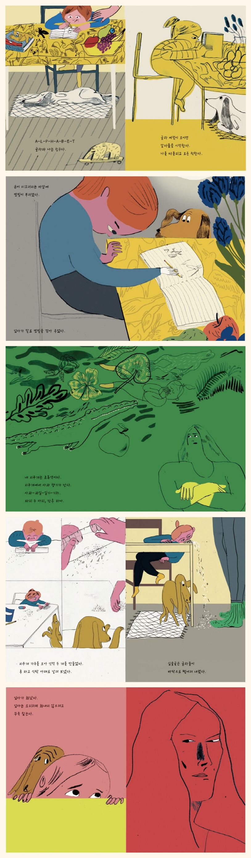 소녀는 식탁에 앉아 알파벳 공부를 시작합니다. 하지만 비슷비슷하게 생긴 글자는 헷갈리고, 점점 어려워집니다. 소녀는 친구라고 믿었던 글자들이 자신을 따돌리고 모른 척하는 것만 같습니다. 소녀는 자꾸만 딴생각에 빠져들고, 결국 잠자는 호랑이를 깨우는데…….
