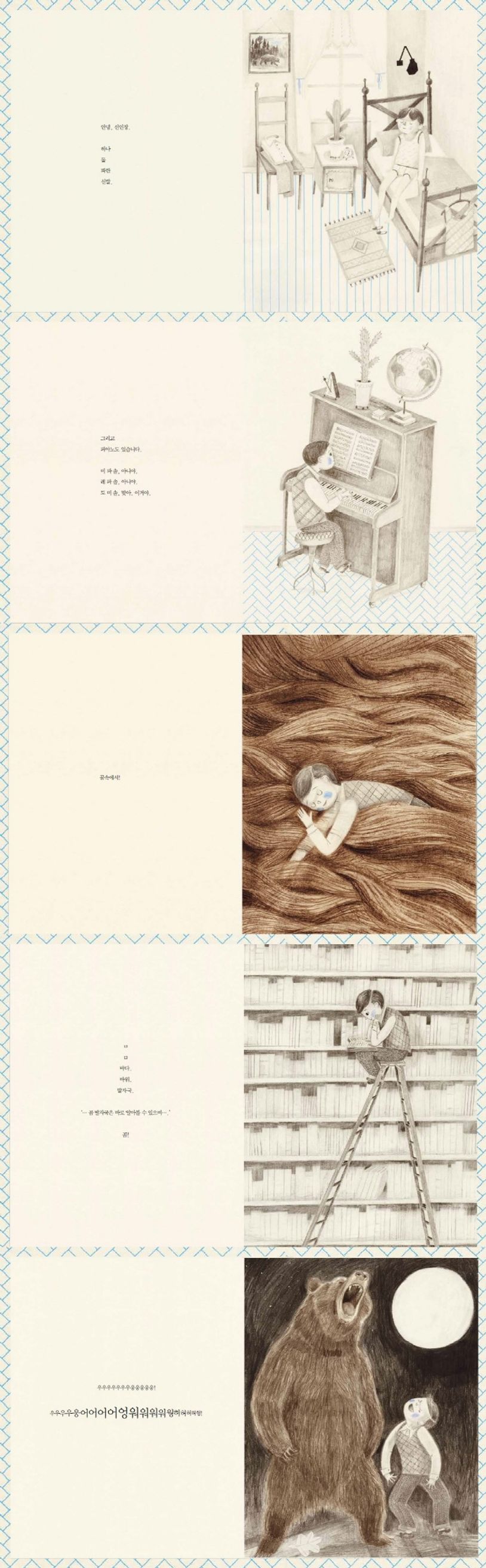 언제나 모든 것이 정돈된 집에 혼자 살던 소년에게 어느 날 커다란 곰이 나타나면서 일어나는 긍정적인 변화를 따뜻하게 그린 그림책입니다. 레베카 바흐-라우리스텐의 시적인 문장과 안나 마르그레테 키에르고르의 섬세한 연필 선에 소년의 오랜 기다림의 시간이 담깁니다. 일상을 뒤흔드는 따뜻한 파문은 소년의 파란 볼을 빨갛게 물들이며 모두에게 희망과 위로를 전합니다. 2020년 북유럽 위원회 아동청소년문학상 최종 후보에 올랐습니다.